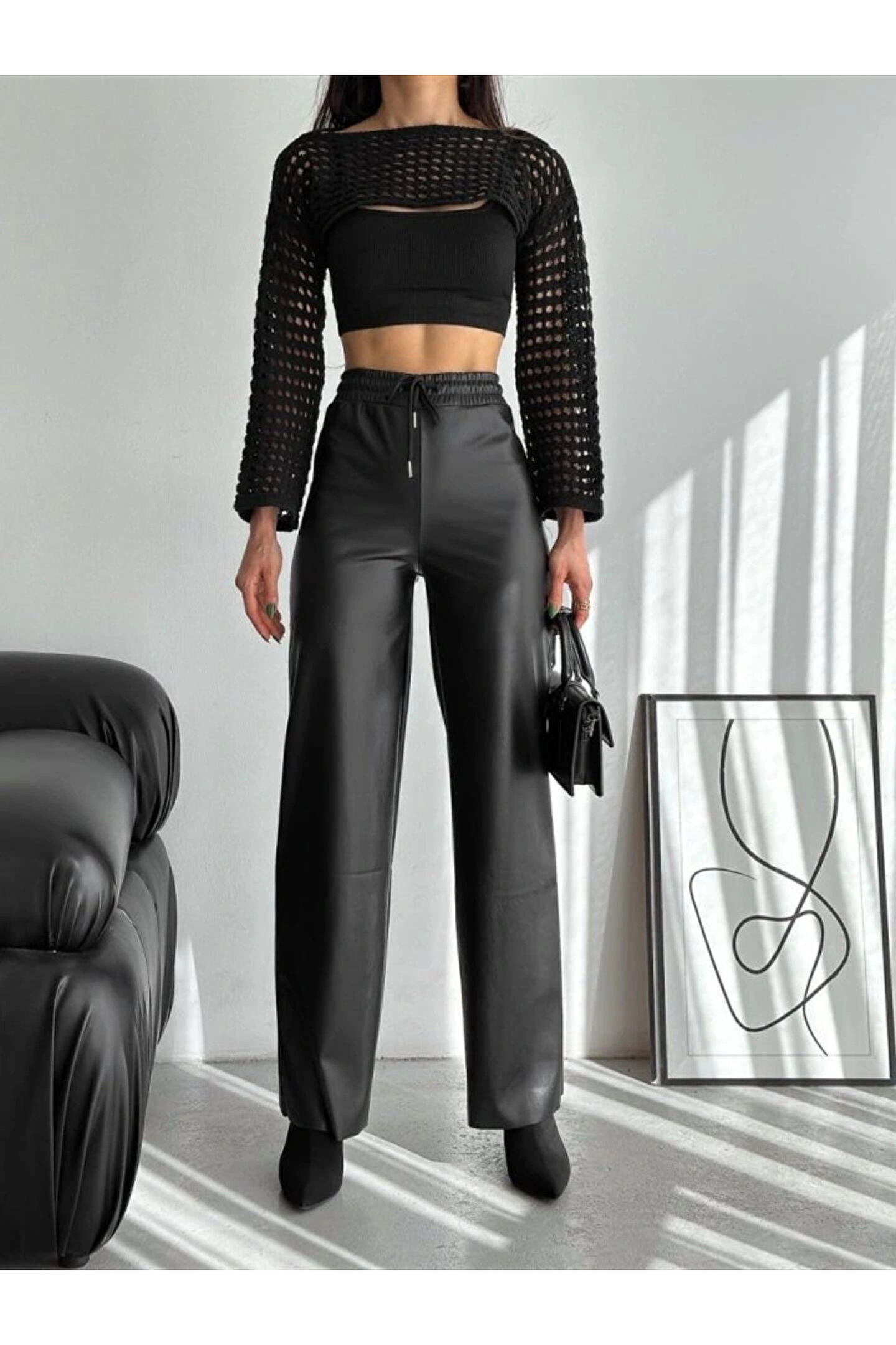 Yüksek Bel Geniş Paça Içi şardonlu Deri Pantolon.