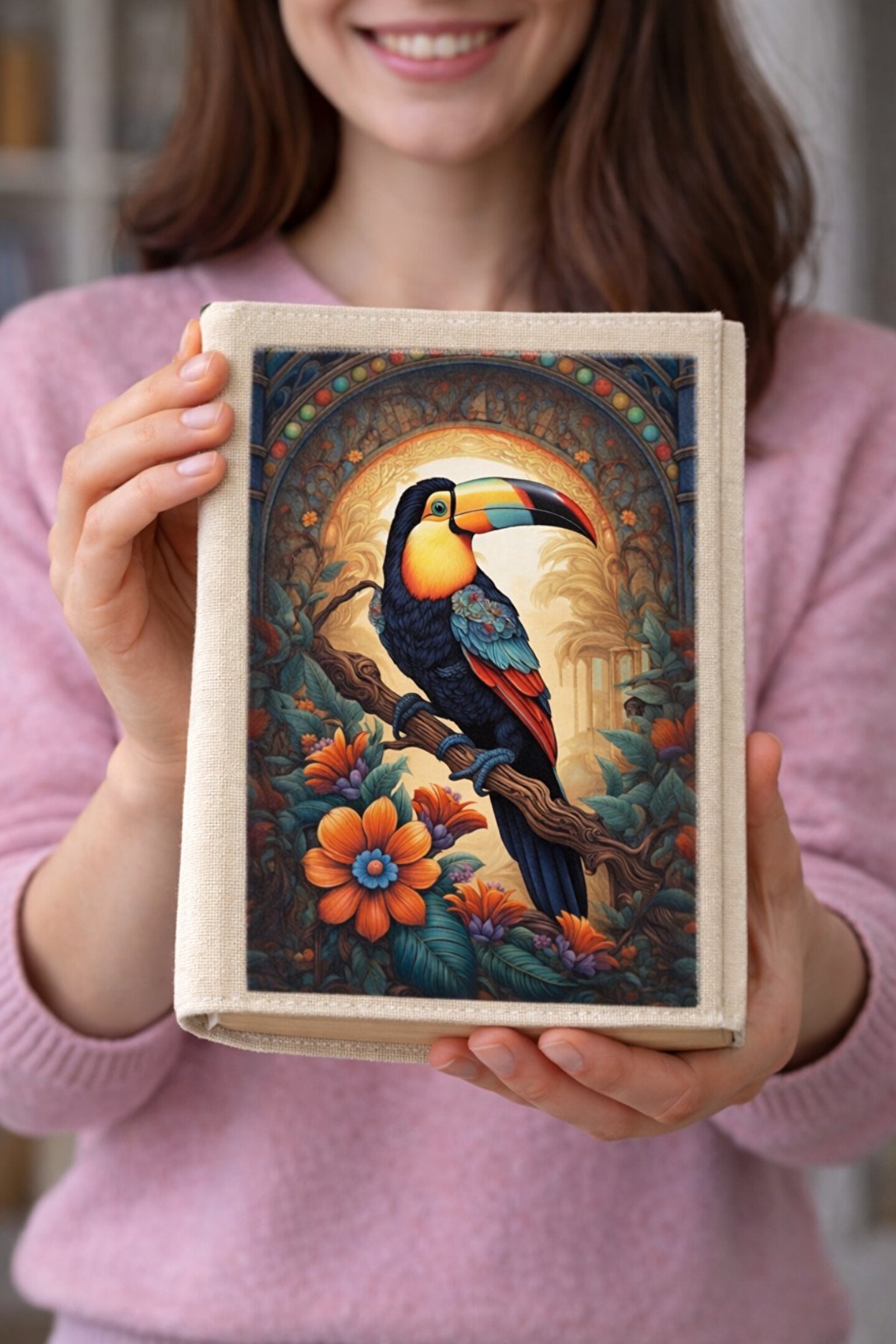 Şımartan 2li Tukan Kuşu Desenli Bez Kitap Kılıfı – Sanatsal Baskılı Kumaş Kitap Kabı, Kitap Koruyucu Kılıf 6