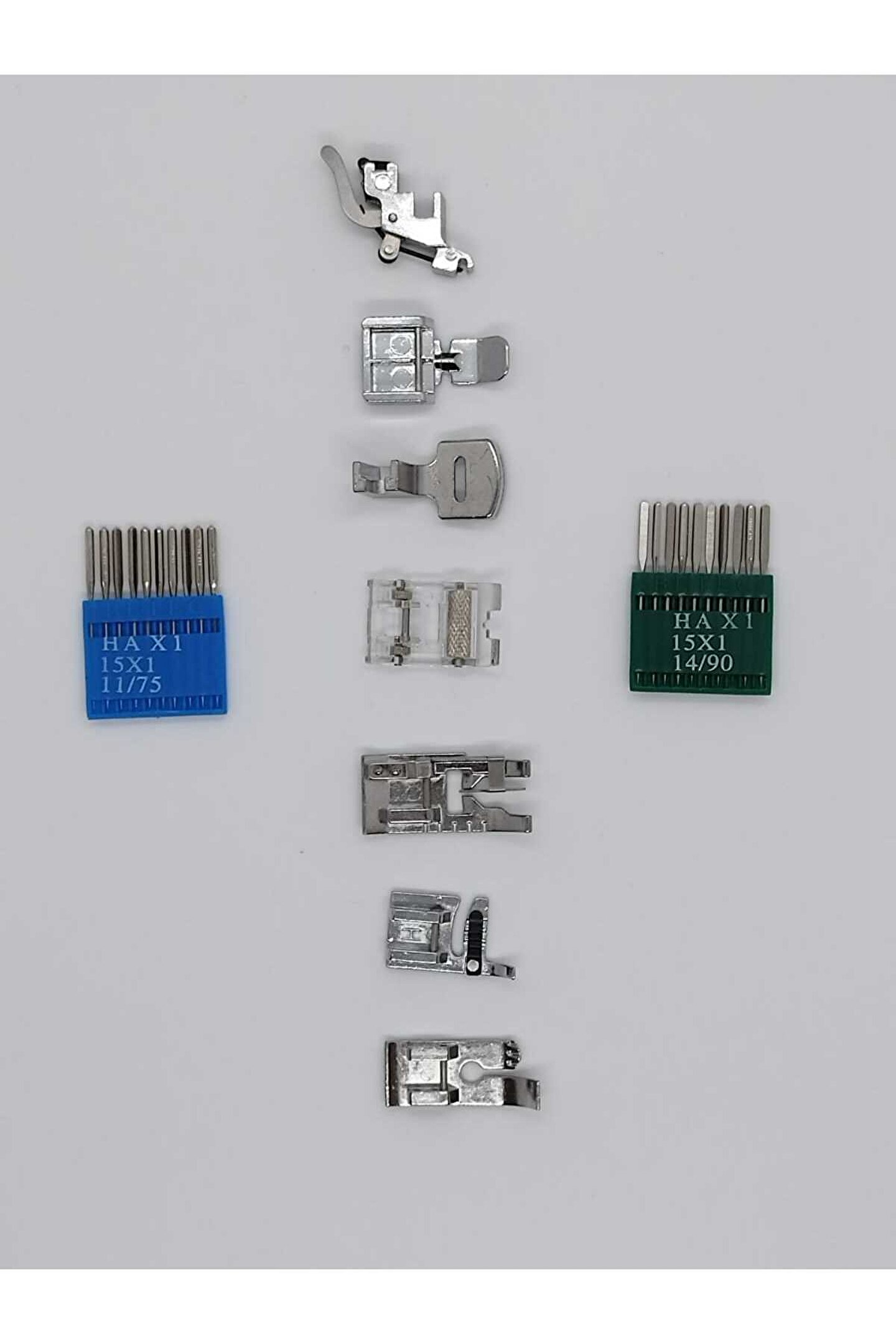 Ev tipi Dikiş makinesi ayak ve iğne seti SETNO:1 Alçak tutucu 1 adet Sağ ve sol fermuar ayak 1 adet Büzgü ayak 1 adet Deri ayak 1 adet Bıçaklı birleştirme ayak 1 adet Üçlü kordon ayak 1 adet Düz ve yorganlama ayak 1 adet Hax 11 no iğne 10 adet Hax 14 no iğne 10 adet