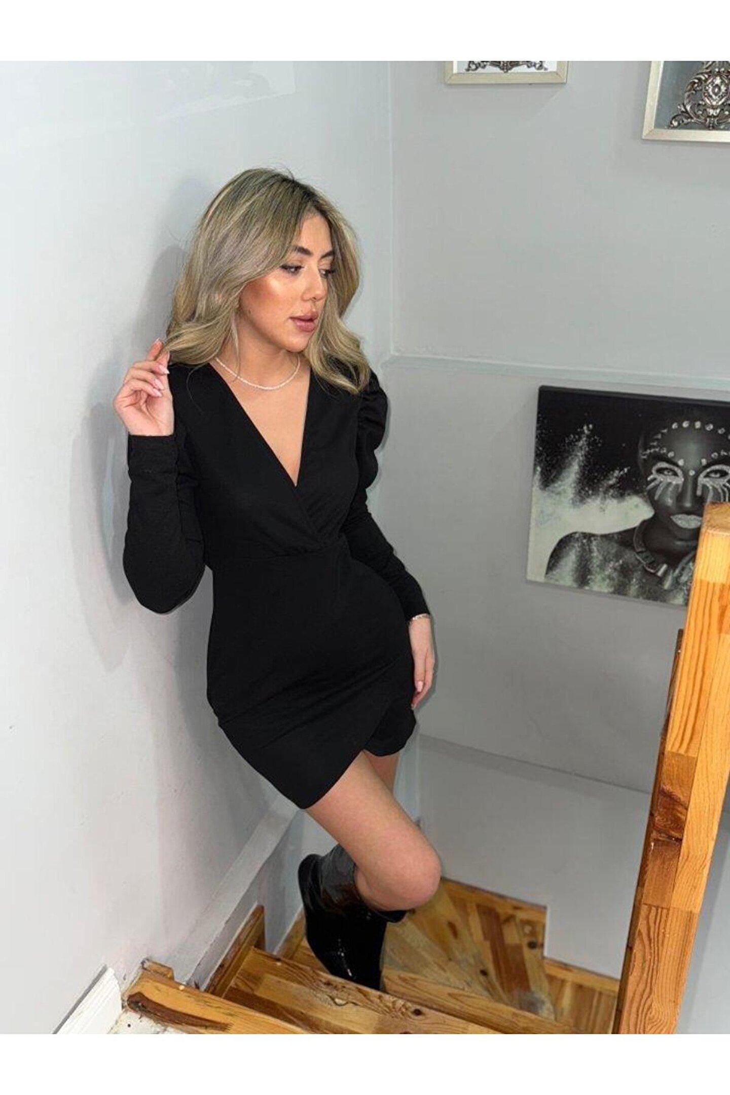 SoSoStyle Kadın Uzun Kollu Kruvaze Yaka Kol Detaylı Ithal Krep Mini Elbise