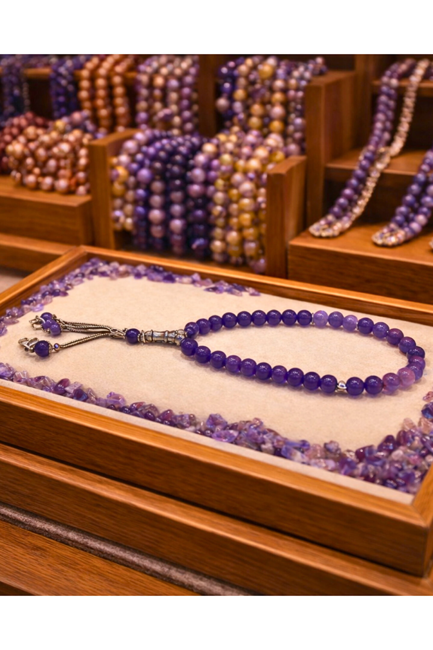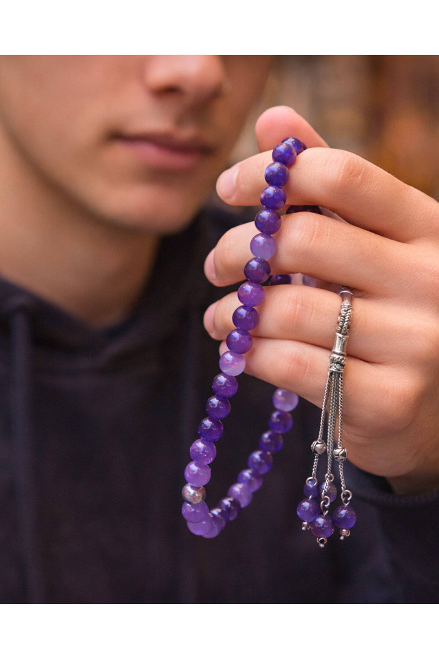 - El yapımı doğal ametist taşı tesbih, her bir parçası özenle işlenmiş, benzersiz bir tasarıma sahiptir.; - Mor rengiyle göz alıcı bir görünüm sunan bu tesbih, şıklığı ve zarafeti bir arada barındırır.; - Düz deseniyle sade ve zamansız bir estetik sunar, her türlü kıyafetle kolayca uyum sağlar.; - Doğal taş kullanımı sayesinde hem estetik hem de manevi bir değer taşır; ametist, sakinlik ve dengeyi temsil eder.; - Türkiye menşeli olmasıyla yerel üretim desteklenmiş olurken, kalite standartlarından ödün verilmez.; - Tek ebat tasarımıyla her parmak yapısına uygunluk gösterir; rahat ve konforlu bir kullanım sunar.