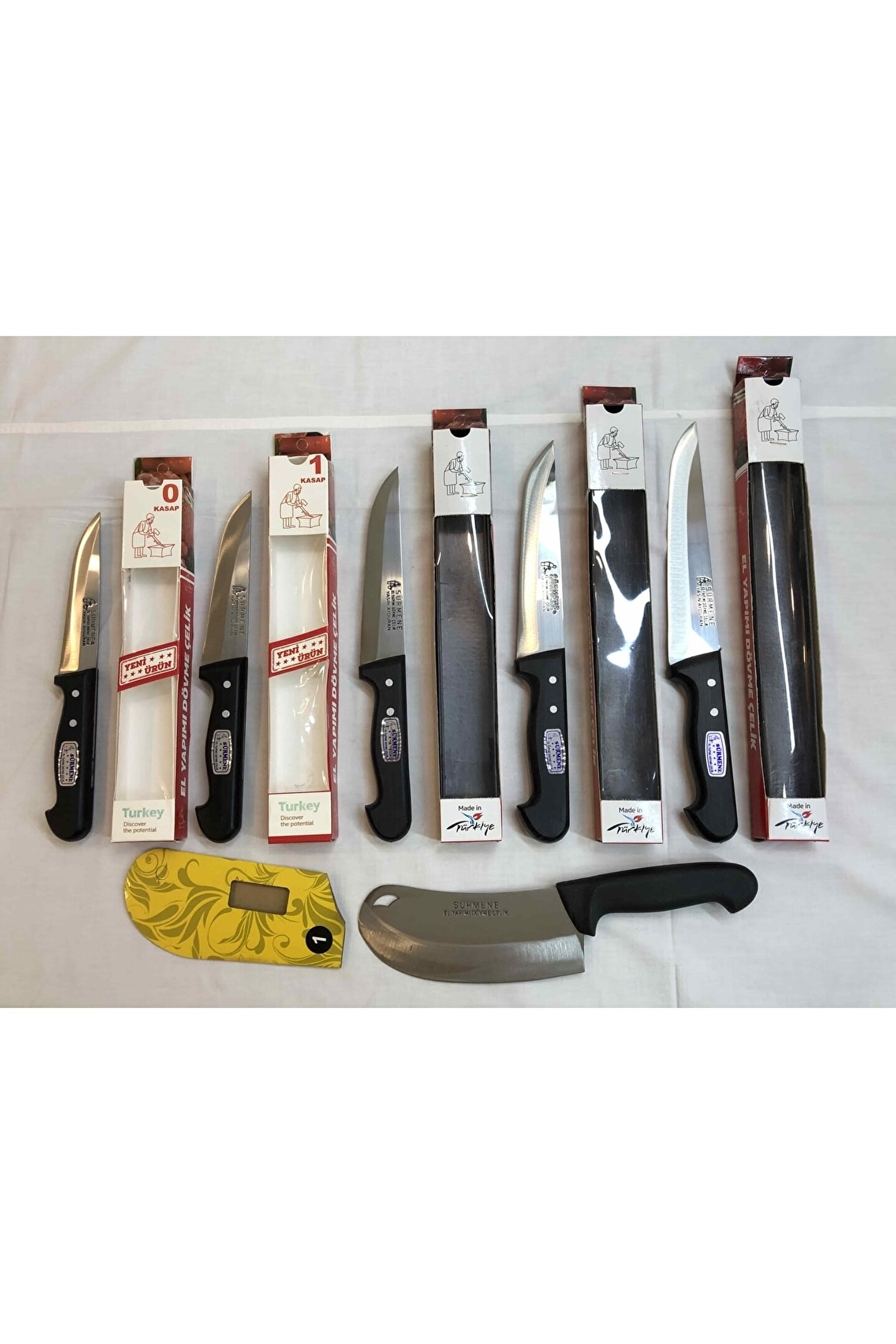 ÇELİK KALINLIĞI : 2,5 mm PASLANMAZ DÖVME ÇUBUK ÇELİK SAP : SiYAH KAYDIRMAZ PLASTiK ÜRÜNÜN AÇIKLAMASI : 0 Numara Bıçak : Tam Boy : 26 Cm Bicak Boyu : 13 Cm En : 3 Cm Ağılık : 107 Gram 1 Numara Bıçak : Tam Boy : 27 Cm Bicak Boyu : 13; 5 Cm En : 3; 5 Cm Ağılık : 125 Gram 2 Numara Bıçak : Tam Boy : 29 Cm Bicak Boyu : 15; 5 Cm En : 3; 5 Cm Ağılık : 137 Gram 3 Numara Bi; ak : Tam Boy : 31 Cm Bicak Boyu : 17; 5 Cm En : 3; 5 Cm Ağılık : 153 Gram 4 Numara Bıçak : Tam Boy : 32; 5 Cm Bicak Boyu : 20 Cm En : 4 Cm Ağılık : 163 Gram 2 Numara Satır : Tam Boy : 29 Cm Bicak Boyu : 16; 5 Cm En : 6; 5 Cm Ağılık : 190 Gram;