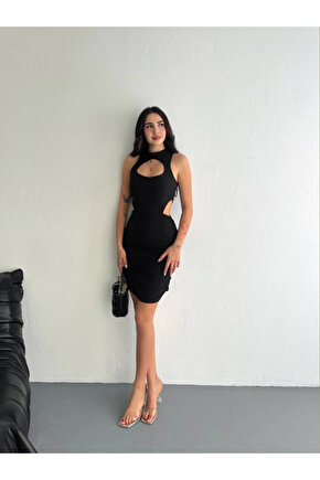 Göğüs Ve Yanlar Dekolteli Kolsuz Boy Elbise - Siyah