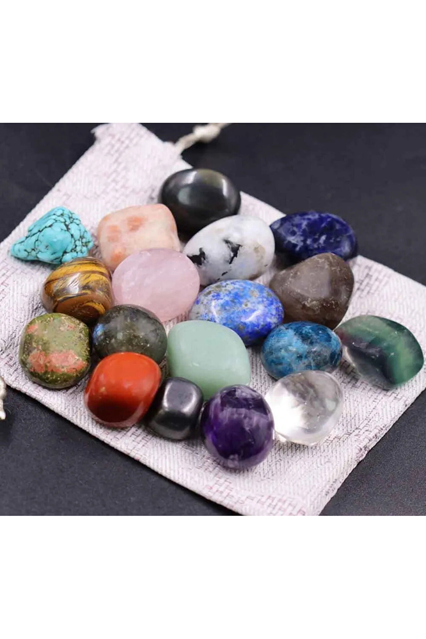 Ürün içeriği birer adet; Ay taşı,labradorit,florit,lapis lazuli,Ametist,kaplan gözü,apatit,kristal kuvars,pembe kuvars,sodalit,güneş taşı,turkuaz,unakit,kırmızı jasper,Aventurin,Obsidyen, dumanlı kuvars,shungite.; Size gelecek ürünler direkt görseldekilerdir.