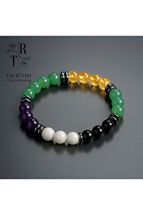- Doğal taş kullanımı sayesinde, her bileklik benzersiz ve otantik bir görünüm sunar; - Ay taşı, ametist, siyah turmalin ve sitrin gibi enerji taşı türleri, bilekliğe şık bir dokunuş katar; - Enerji bilekliği olarak tasarlanmış bu bileklik, kişisel enerjinizi dengelemenize yardımcı olabilir; - Doğal taşların sunduğu zarif ve doğal güzellik, günlük kullanım için idealdir;