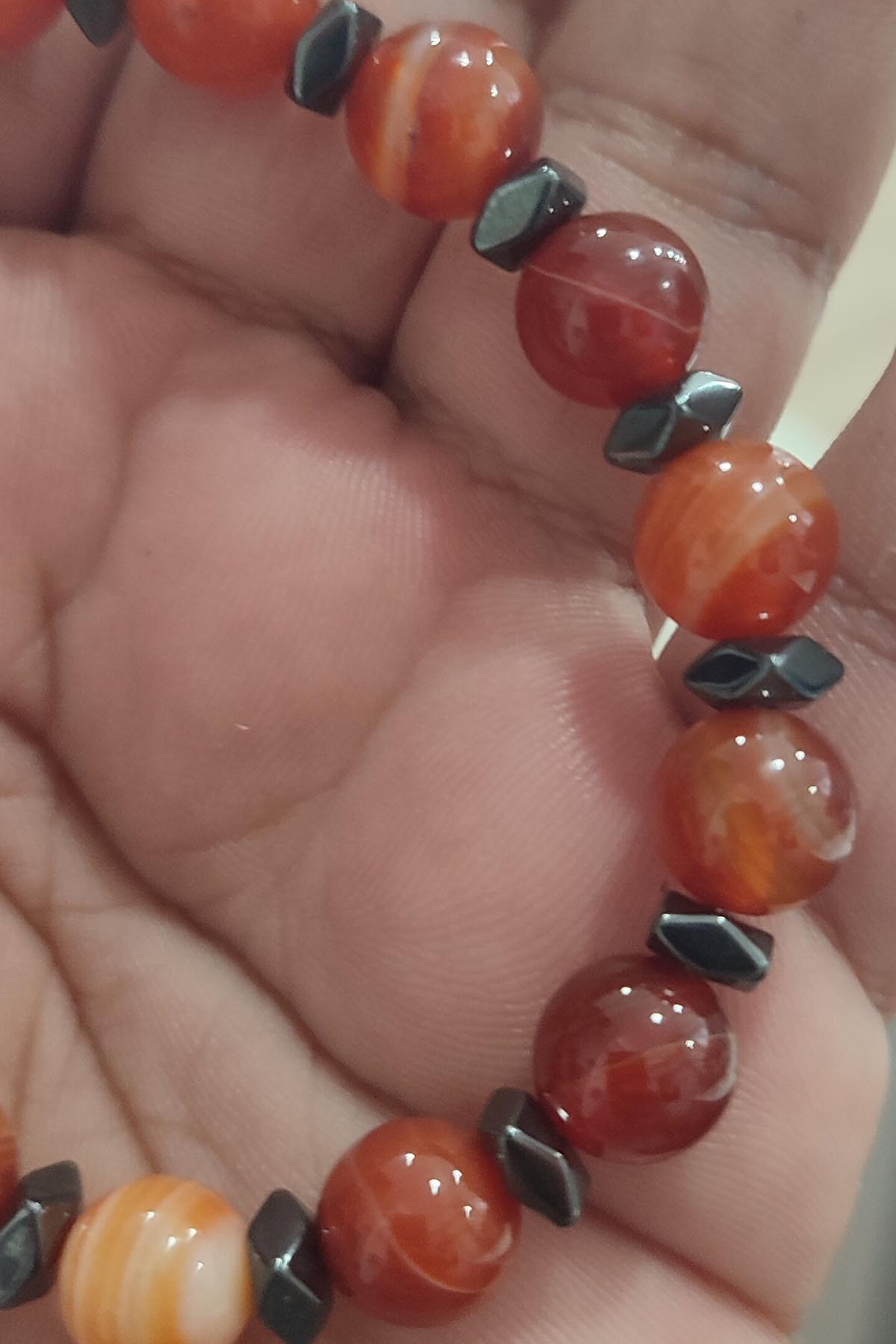 Doğal akik taşı kullanılarak üretilmiş, şıklığı ve zarafeti bir arada sunan bileklik; Hematit ara taşlarla süslenmiş, göz alıcı bir görünüm kazandırarak her türlü kıyafetle uyum sağlar; 10 mm boyutundaki akik taşı, bileklikte rahat bir kullanım sunarken, doğal dokusuyla dikkat çeker; Doğal taşların benzersiz desenleri ve renkleri, her bir bileklikte farklılık gösterir; bu da her bir parçayı eşsiz kılar;
