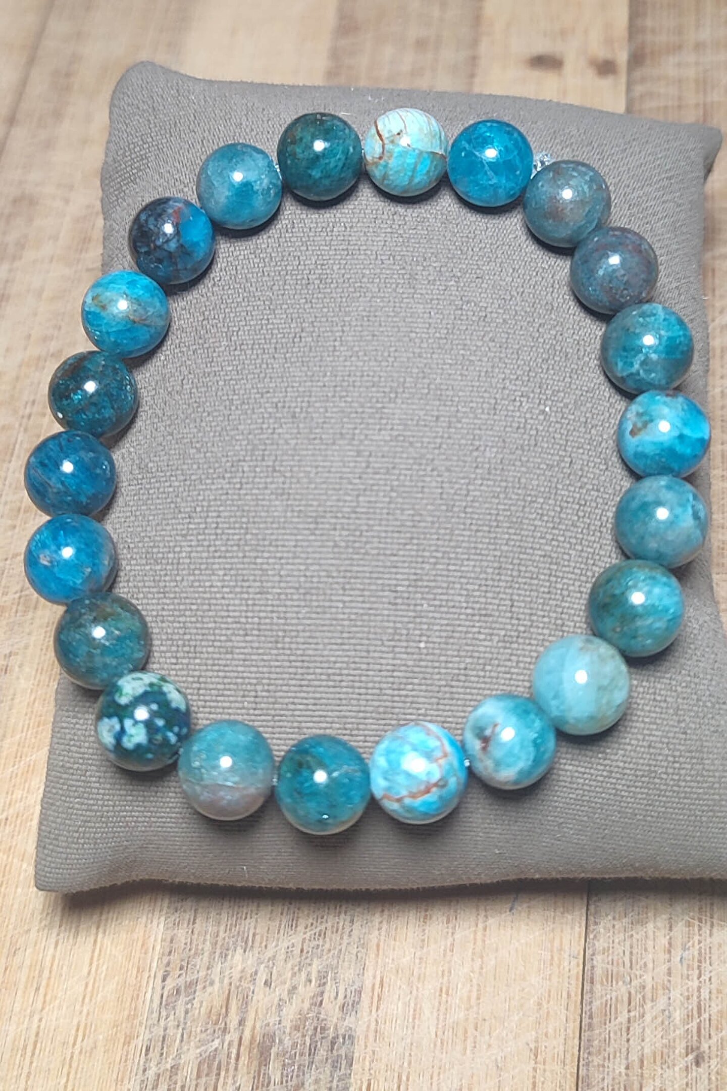 Doğal Apatit taşı kullanılarak üretilmiş, şıklığı ve doğallığı bir arada sunan bileklik; 8 mm boyutundaki taşlar, zarif ve modern bir görünüm sağlar; Apatit taşı, enerji veren ve pozitif titreşimler yayan bir mineraldir; Her bileklik benzersizdir; her biri farklı bir desen ve renk tonuna sahiptir;
