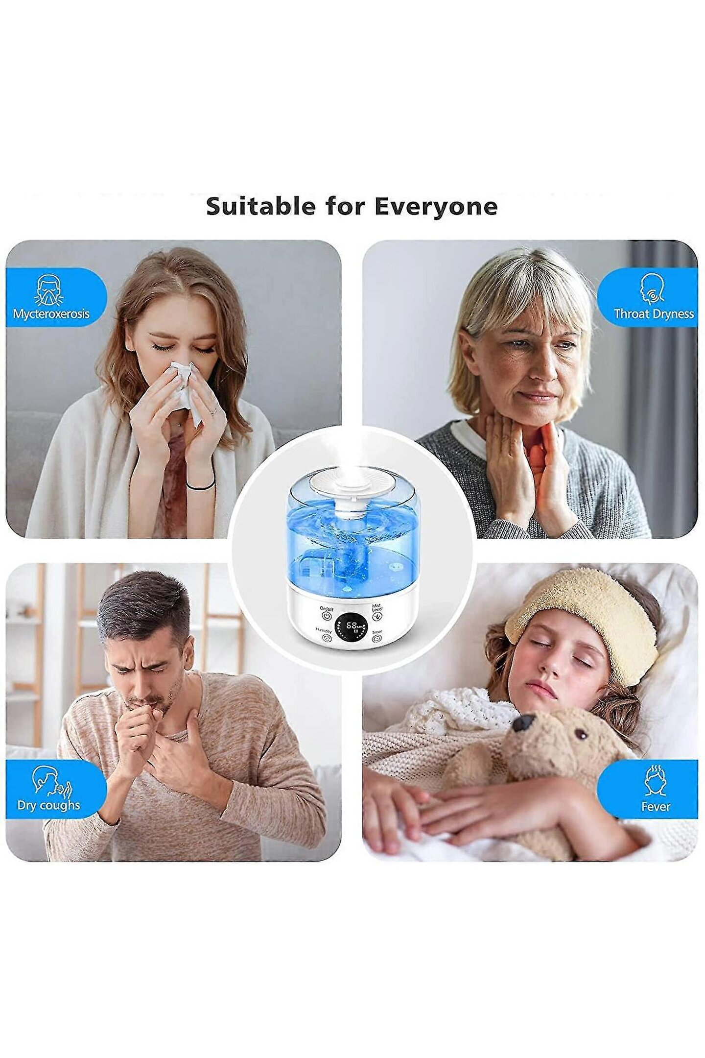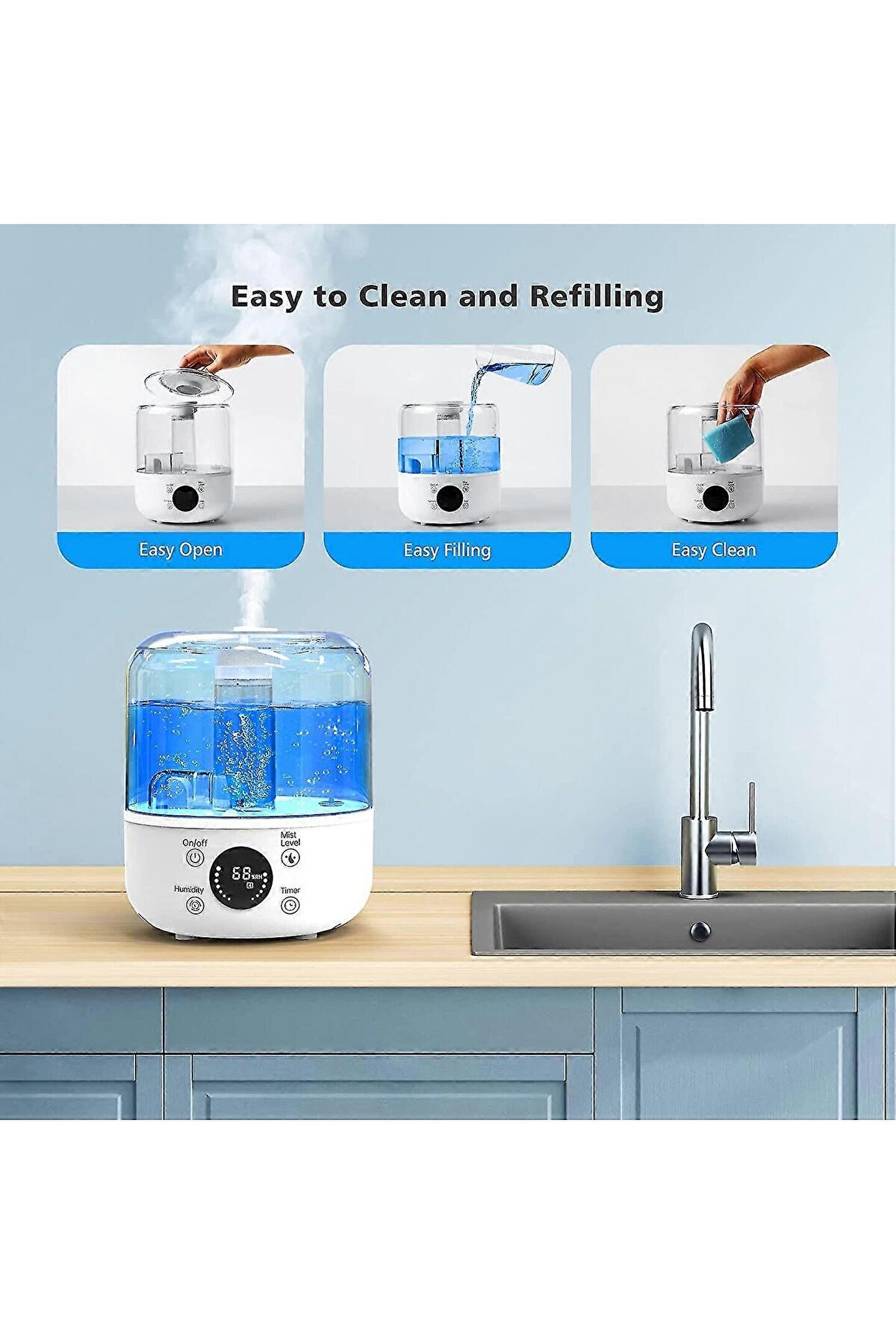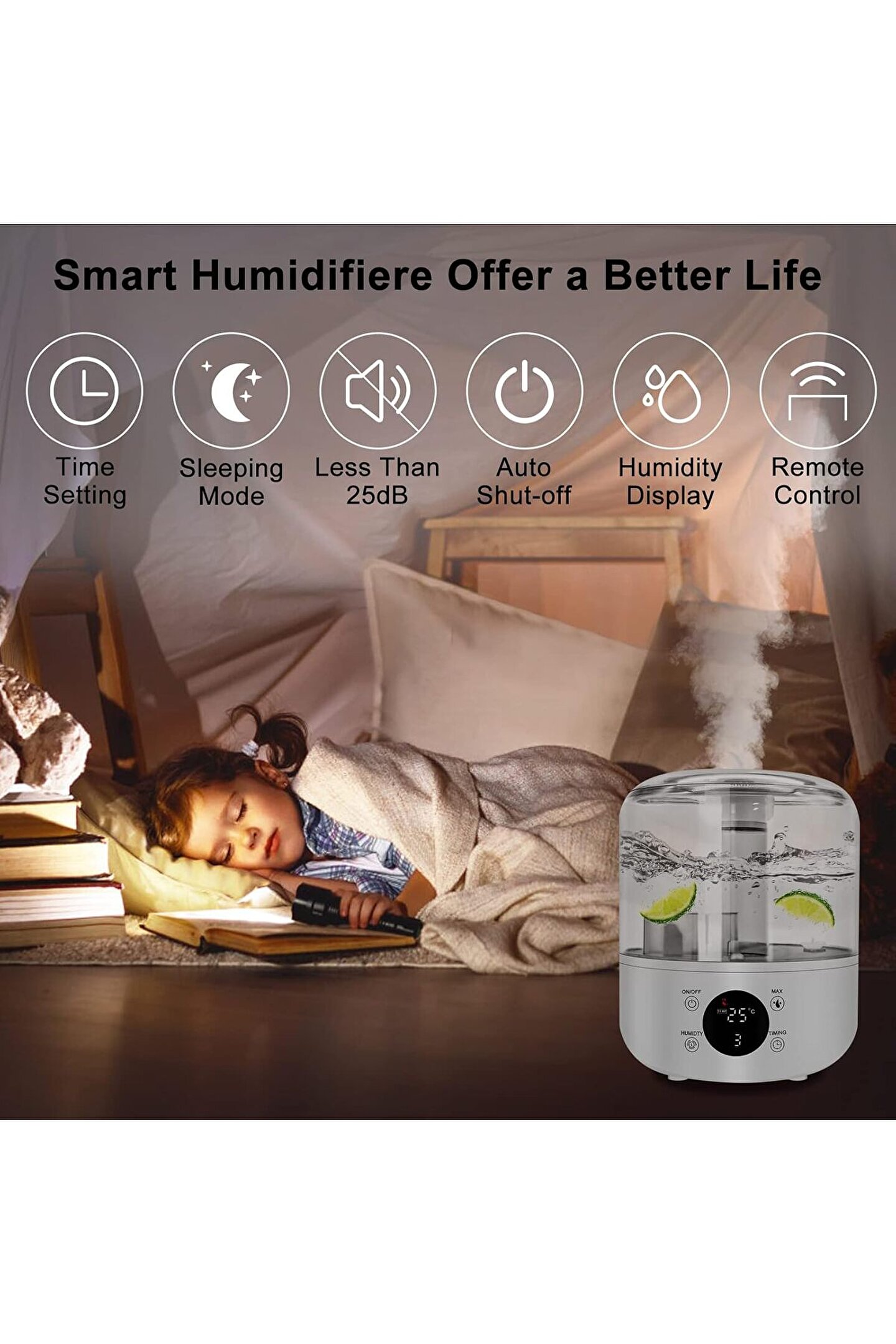 2'si 1 arada hava nemlendirici ve difüzör – Nemlendirici hem nemlendirici hem de uçucu yağ difüzörü olarak işlev görür, böylece uçucu yağları hava nemlendiricisinin sisi ile kombine ederek en sevdiğiniz kokuları odaya dağıtabilirsiniz.; Öksürüğü, tahriş olmuş burun yollarını ve boğazı hafifletir.; Serin ve sıcak sis, sıcak ve kuru havalarda burun kanallarını, sinüsleri ve cildi nemlendirir.; ?.; 360° dönebilen hava nemlendirici – Döner düğme sis kontrolü, 360° dönebilen sprey, çift püskürtme başlığı, çepeçevre nemlendirme, daha iyi nemlendirme etkisi ile geliştirilmiştir.; Sis çıkış ses seviyesini konfor için ideal nem seviyesine ayarlayabilirsiniz.; Su bittiğinde veya su seviyesi düştüğünde otomatik olarak kapanır.; Bu size yüksek enerji tasarrufu sağlayan maksimum koruma sağlar.; Akıllı nem sensörü – Modern nem sensörü odadaki nemi algılar.; İstenen nem derecesine ulaşmak için odanın ne kadar nemlendirilmesi gerektiğini hemen algılar.; Ayrıca hava nemlendirici istenen hava nemine ulaşıldığında kapanır ve nem tekrar düştüğünde tekrar açılır.; 3 l büyük kapasite ve süper sessiz – 3 l su tankı 10 saate kadar kesintisiz püskürtme ve 30 m²'ye kadar odalar için hızlı hava nemlendirme sağlar, böylece yatak odası, oturma odası, ofis gibi her yerde daha kolay nefes alabilirsiniz.; Büyük ultrasonik nemlendirici, sizi veya bebeğinizi geceleri uyanık tutmayan sessiz bir nemlendirme için 28 dB'den az gürültü üretir.; ?.; Uzaktan kumanda ve zamanlayıcı – Hava nemlendiriciyi uzaktan kumanda ile uzaktan kumanda edin! Sis seviyesini, sis sıcaklığını ve daha fazlasını ayarlayabilirsiniz.; Zamanlayıcıyı 0 – 8 saate ayarlayın ve nemlendirici zaman dolduktan sonra kapanır.; Artık enerji israfı yok.;