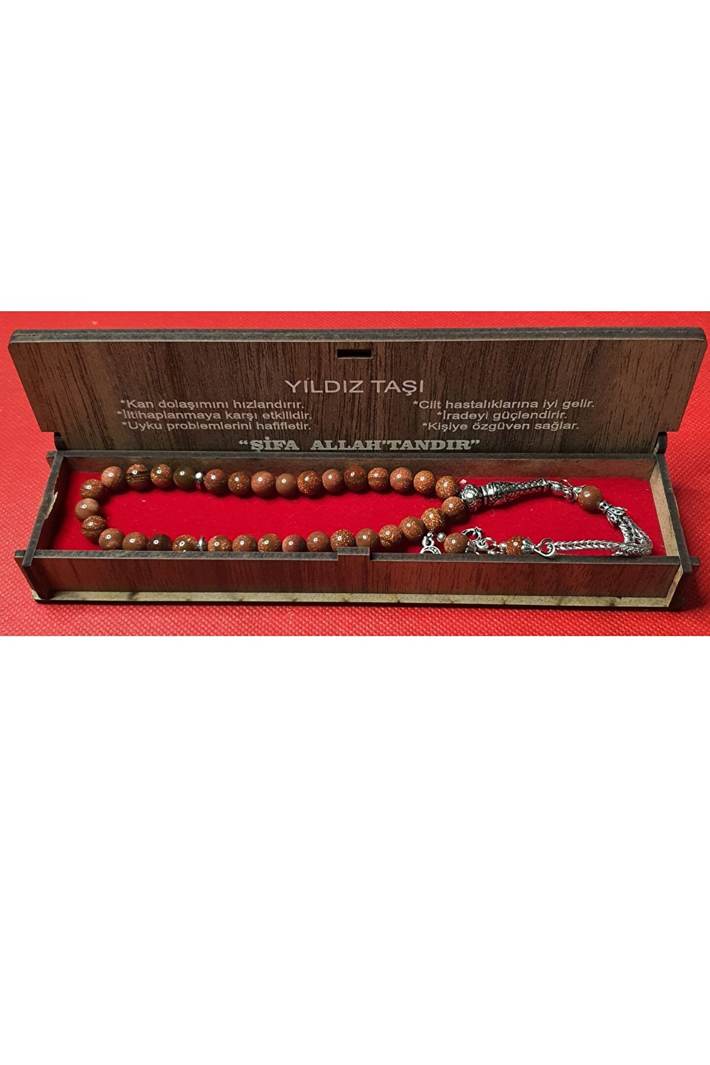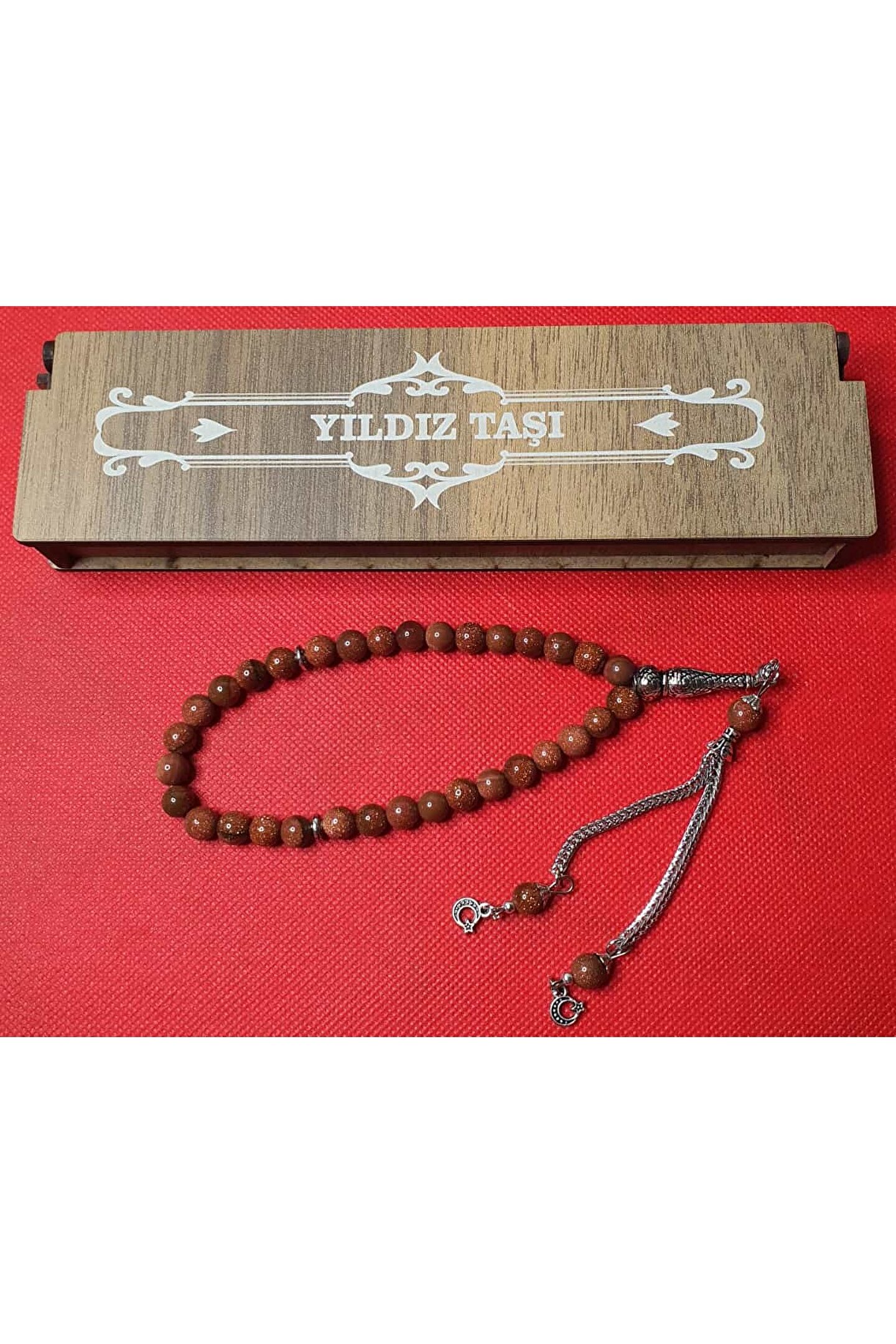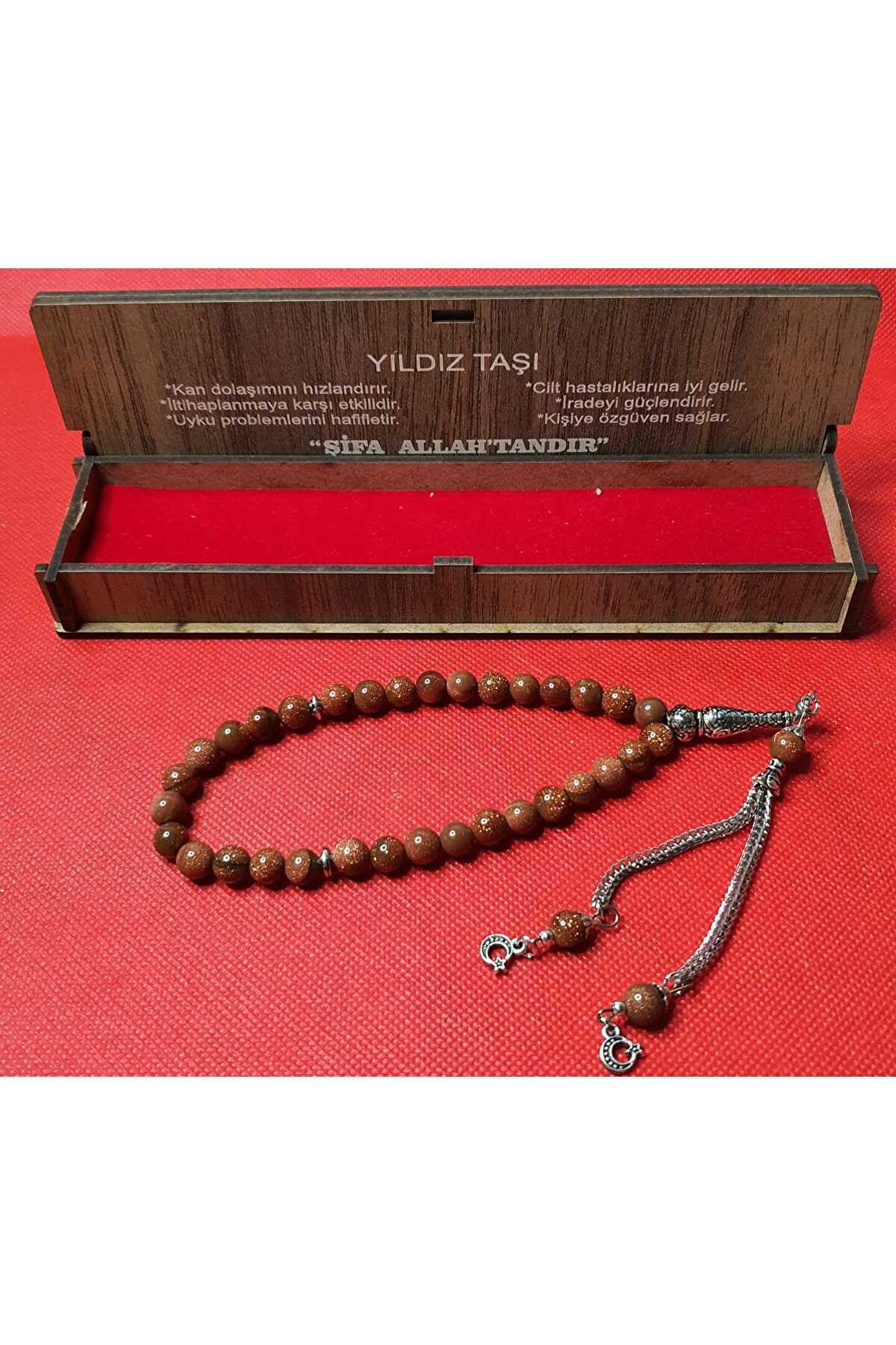 Doğal taş malzemesiyle üretilmiş, her bir tespih tanesi özenle seçilmiş ve işlenmiş, şık bir görünüm sunar; Yıldız taşı kullanımı sayesinde, hem estetik hem de manevi bir değer taşıyan bu tesbih, özel günlerde anlamlı bir hediye seçeneği oluşturur; 33'lük set içeriğiyle tamamlanan bu tesbih, uzun süreli kullanım için idealdir ve her bir tespih tanesi ayrı ayrı kutulu olarak sunulur;