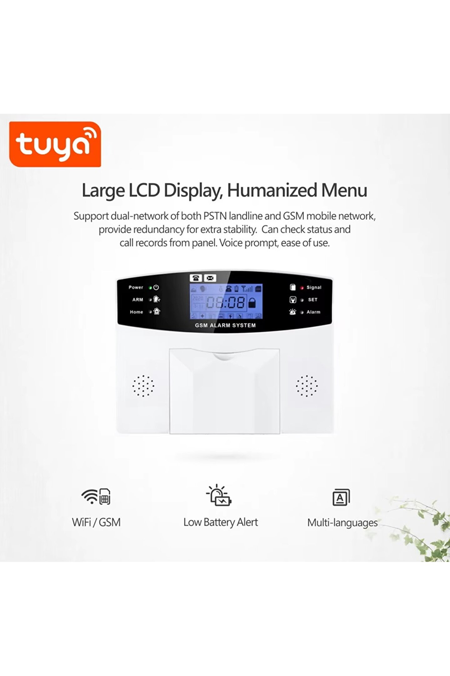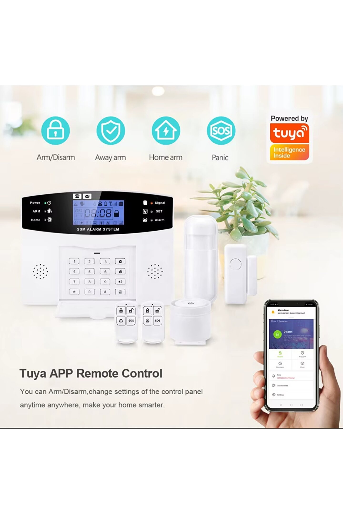 A: bu bir Tuya destekli GSM alarm sistemi. Evinizi/mülkünüzü izlemek için GSM ve Tuya smart tech'i, kurma, arming landırma ve uyarı gönderme gibi işlevlerle kullanır.