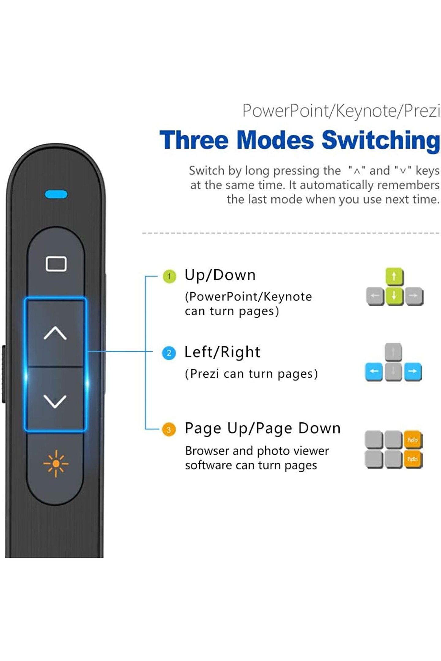 Öne Çıkan İşlevler: ①Support PowerPoint Köprüsü - Sunumlar için bu lazer işaretçisi, PowerPoint'inizdeki köprüleri seçmenize, açmanıza ve etkin pencereyi kapatmanıza yardımcı olabilir. Powerpoint sunumları için ideal bir tıklayıcıdır; ②Support Ses Kontrolü.