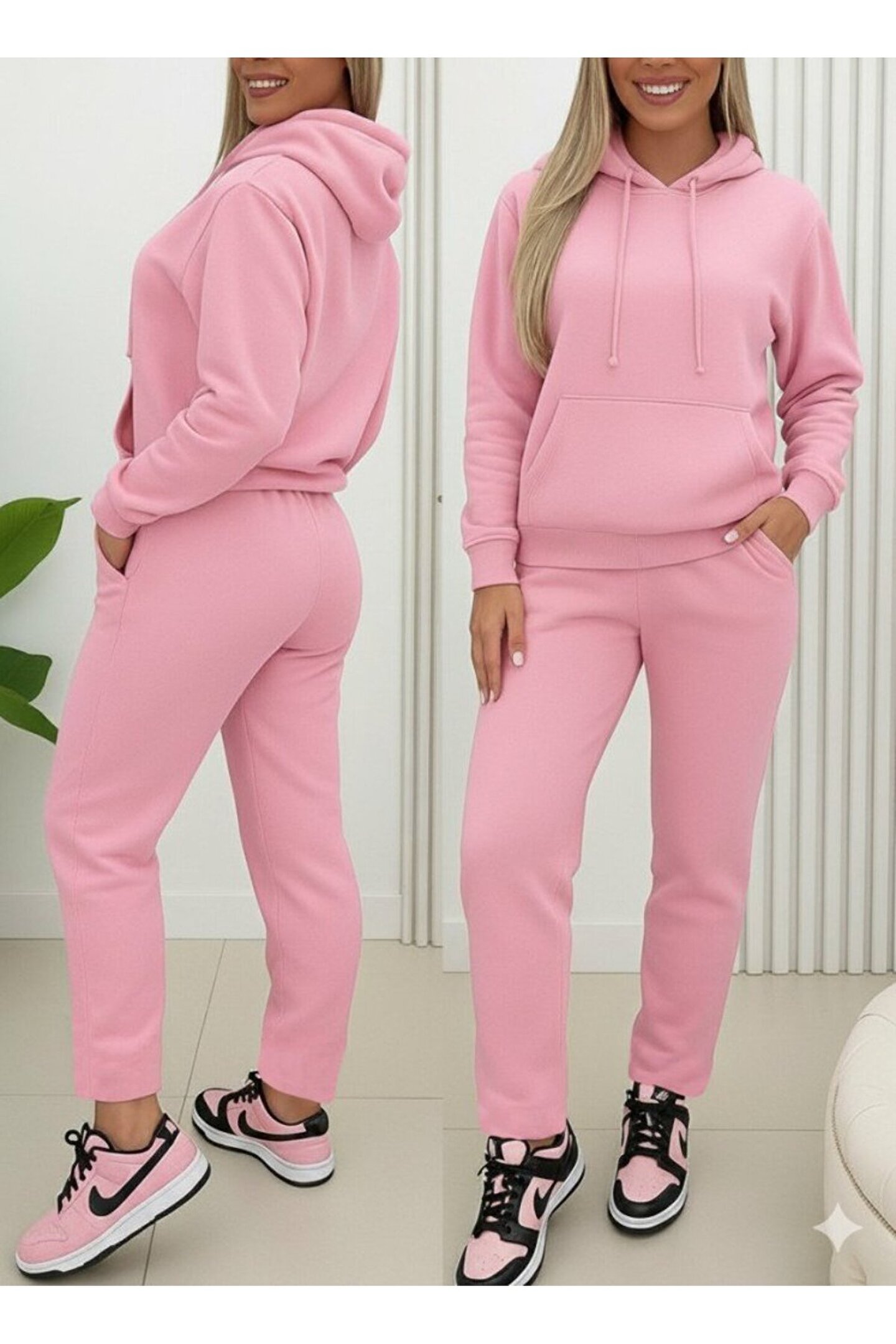 Kadın Uzun Kollu Kapşonlu Bağcıklı üç Iplik Bluz Ve Pantolon Ikili Takım