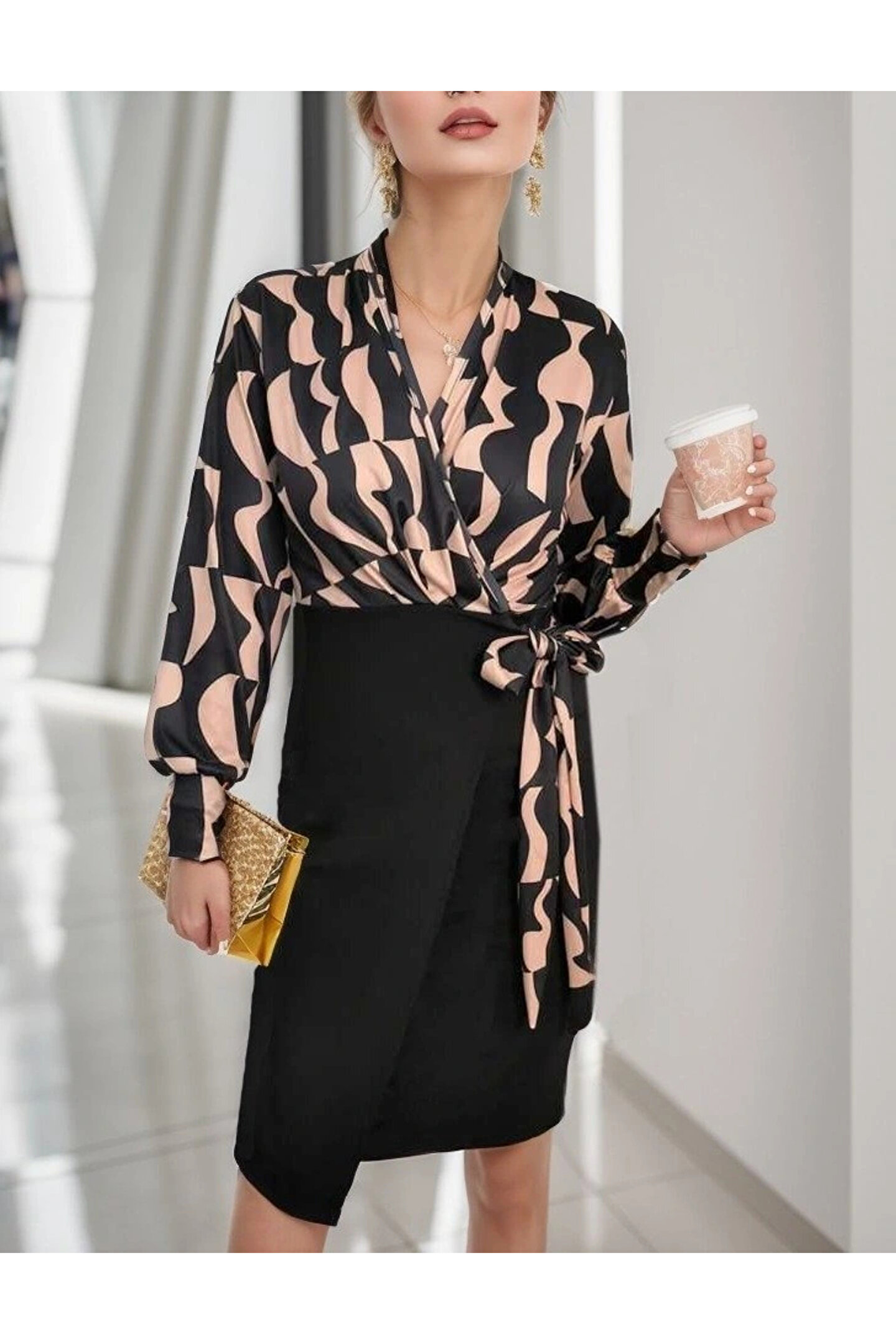 TBL DEKOR Kadın Uzun Kollu Kruvaze Yaka Dijital Baskılı Fiyonk Detay Atlas Kumaş Elbise