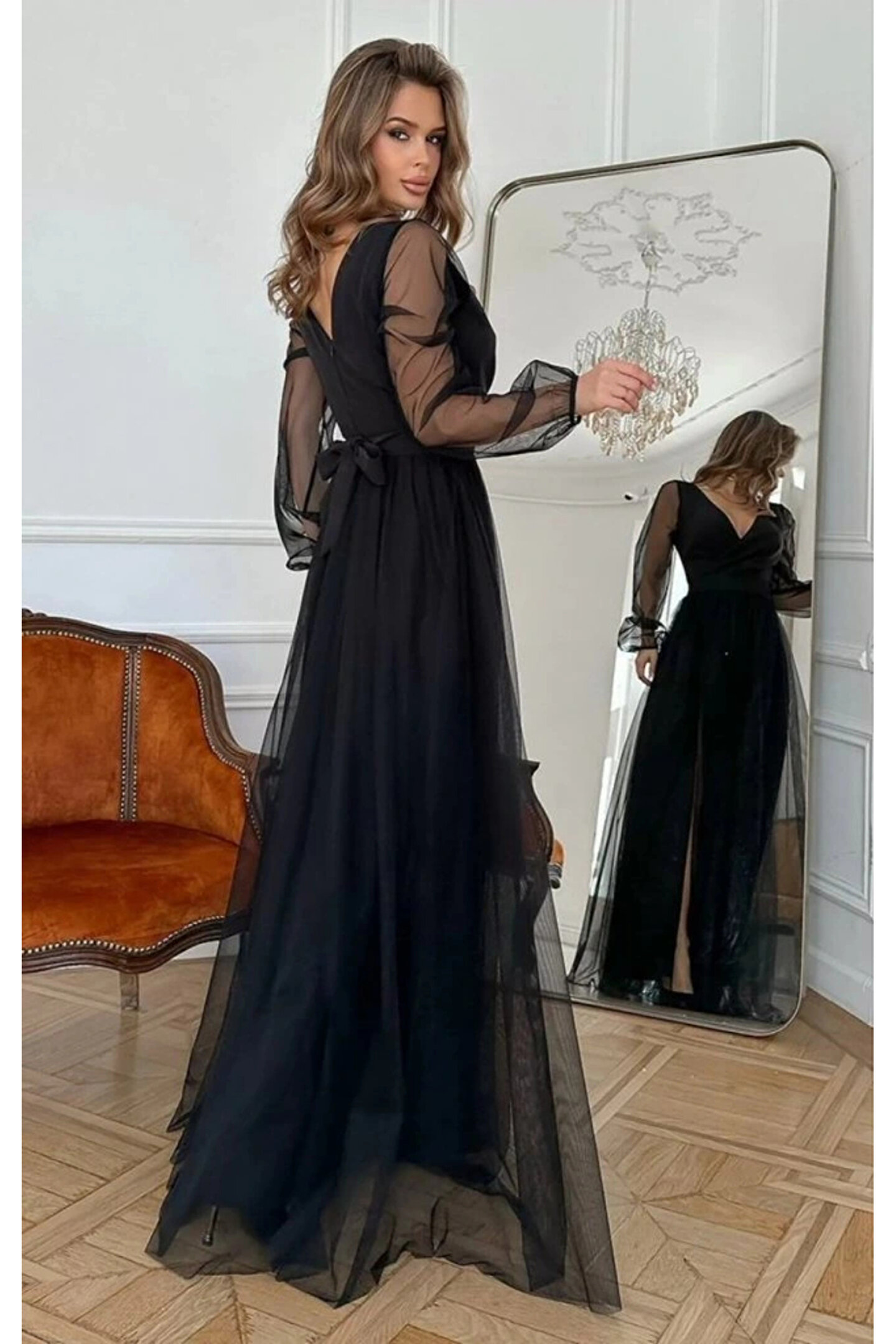 TBL DEKOR Kadın Uzun Kollu Kruvaze Yakalı Belden Kuşaklı Tüllü Uzun Ithal Krep Elbise