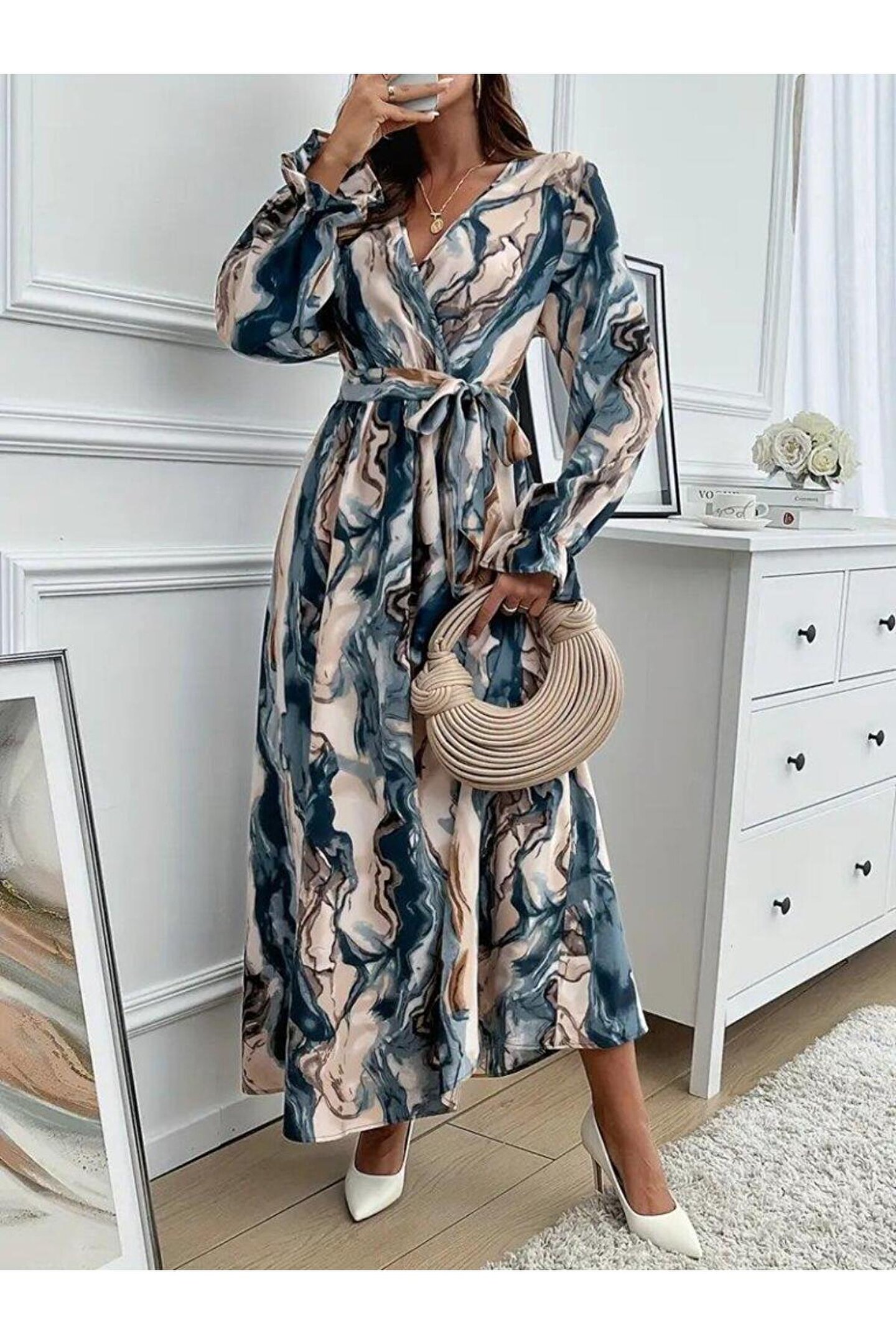 TBL DEKOR Kadın Uzun Kollu Kruvaze Yakalı Beli Kuşaklı Desenli Süprem Maxi Elbise