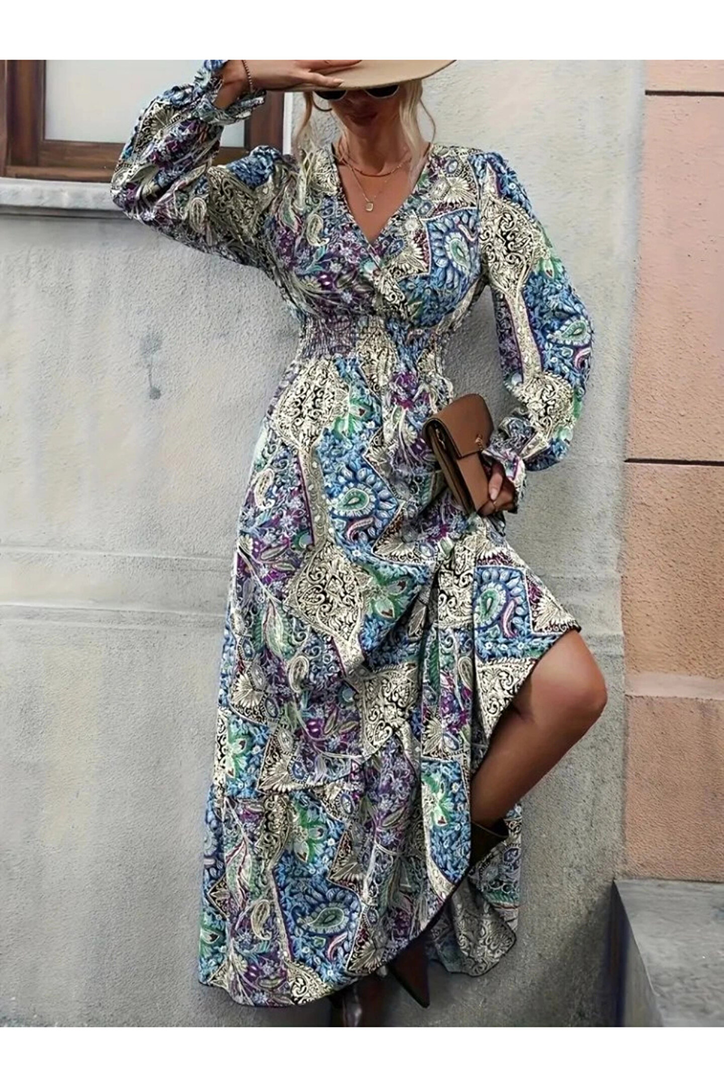Kadın Uzun Kollu Kruvaze Yakalı Desenli Süprem Maxi Elbise