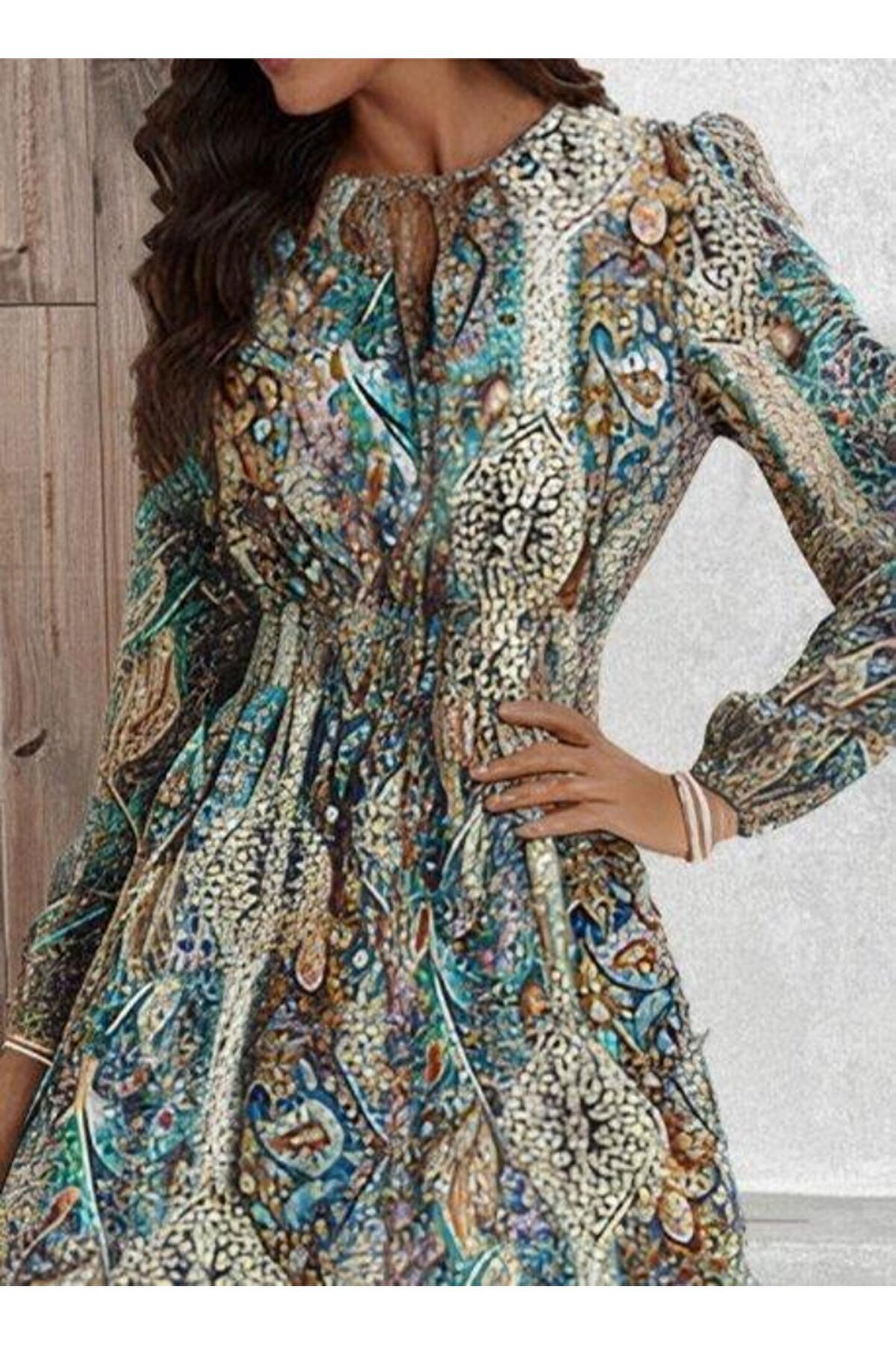 TBL DEKOR Kadın Uzun Kollu Uakadabağcıklı Beli Lastikli Desenli Uzun Süprem Elbise