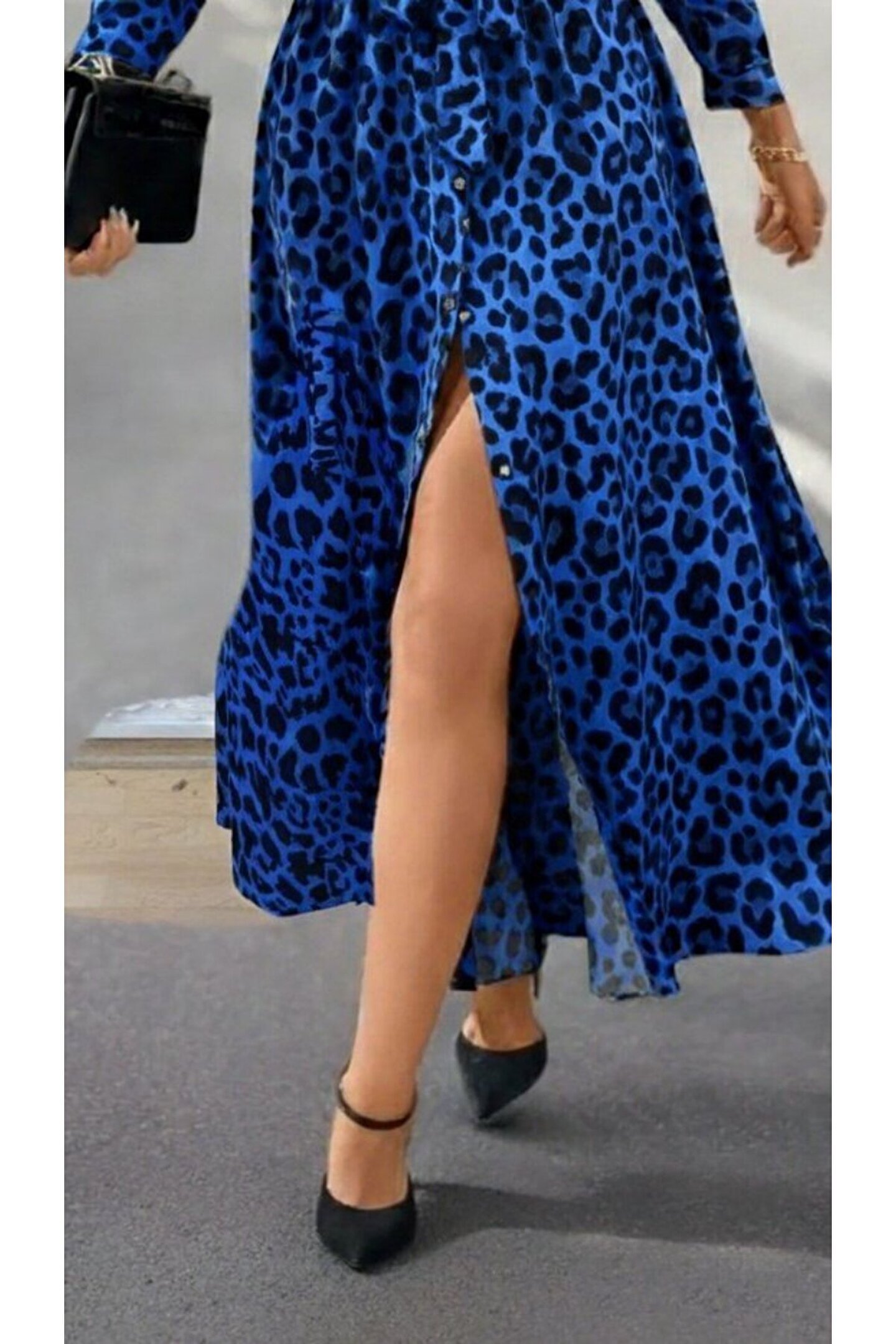 Kadın Uzun Kollu Yakalı Belden Kuşaklı Leopar Desenli Modal Uzun Elbise
