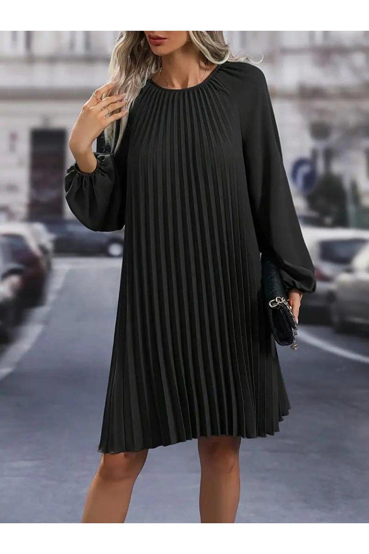 Kadın Uzun Kollu Yuvarlak Yaka Pileli Salaş Mini Ithal Krep Elbise