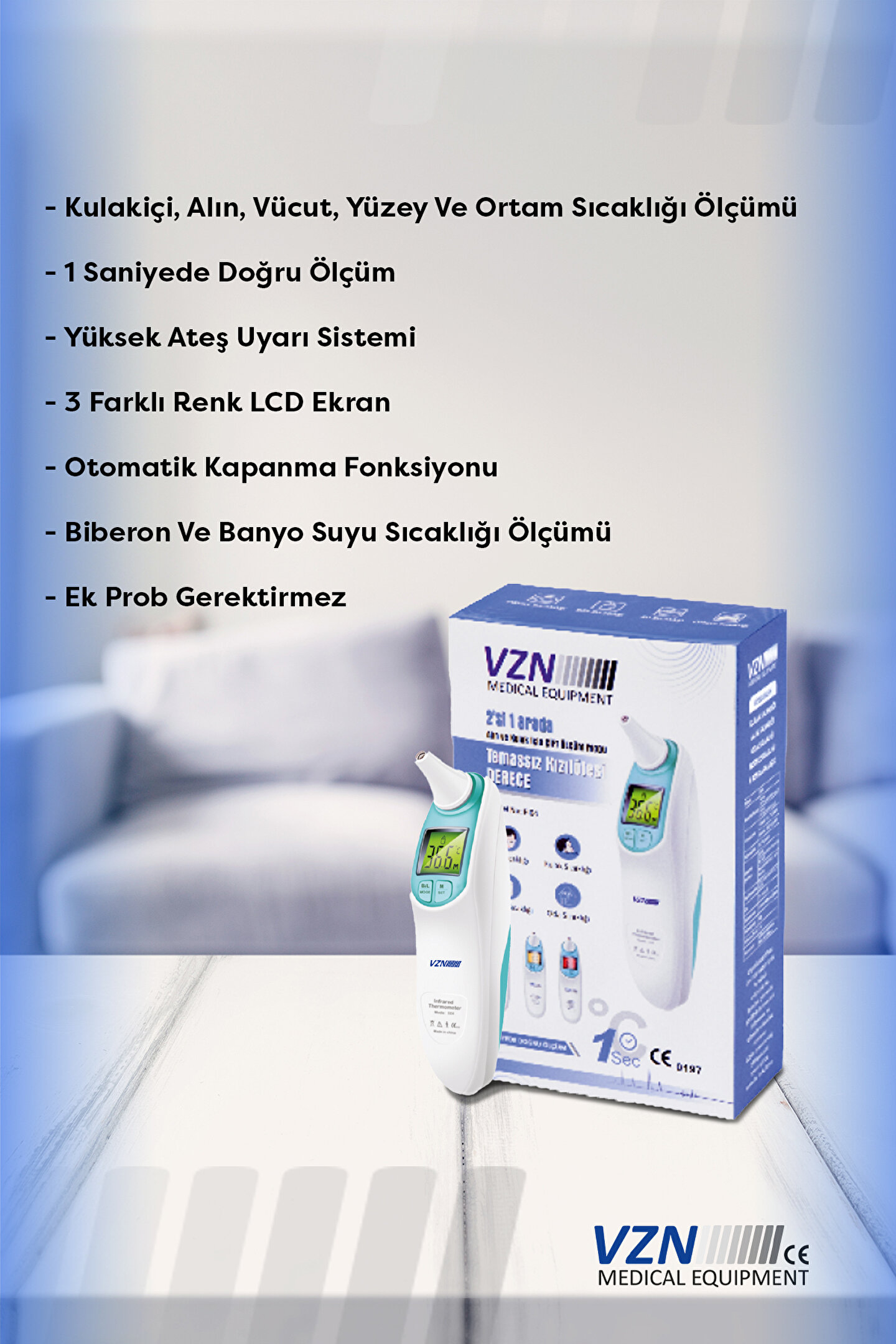 Alın Ve Kulak Için Temazsız Ateş Ölçer Çoklu Fonksiyon : Kulak, alın, oda sıçaklığını dijital olarak ölçer. ; Hijyenik : Sadece silerek temizleyin, prob kılıfları gerektirmez. ; Hızlı ve Doğru : 3. ; nesil sıcaklık ölçüm teknolojisinden faydalanın, sadece 1 saniyede doğru okuma. ; Kolay Kullanım : Sadece bir düğme ile çalıştırma, çok basit kullanım. ; Bellek Fonksiyonu : Cihaz açıldığında son etkili vücut sıcaklığını gösterir. ; Renkli ana ekranı mevcuttur. ; Vücut, süt, su ve ortam sıcaklığını da ölçer. ; 2 yıl garantisi vardır.;
