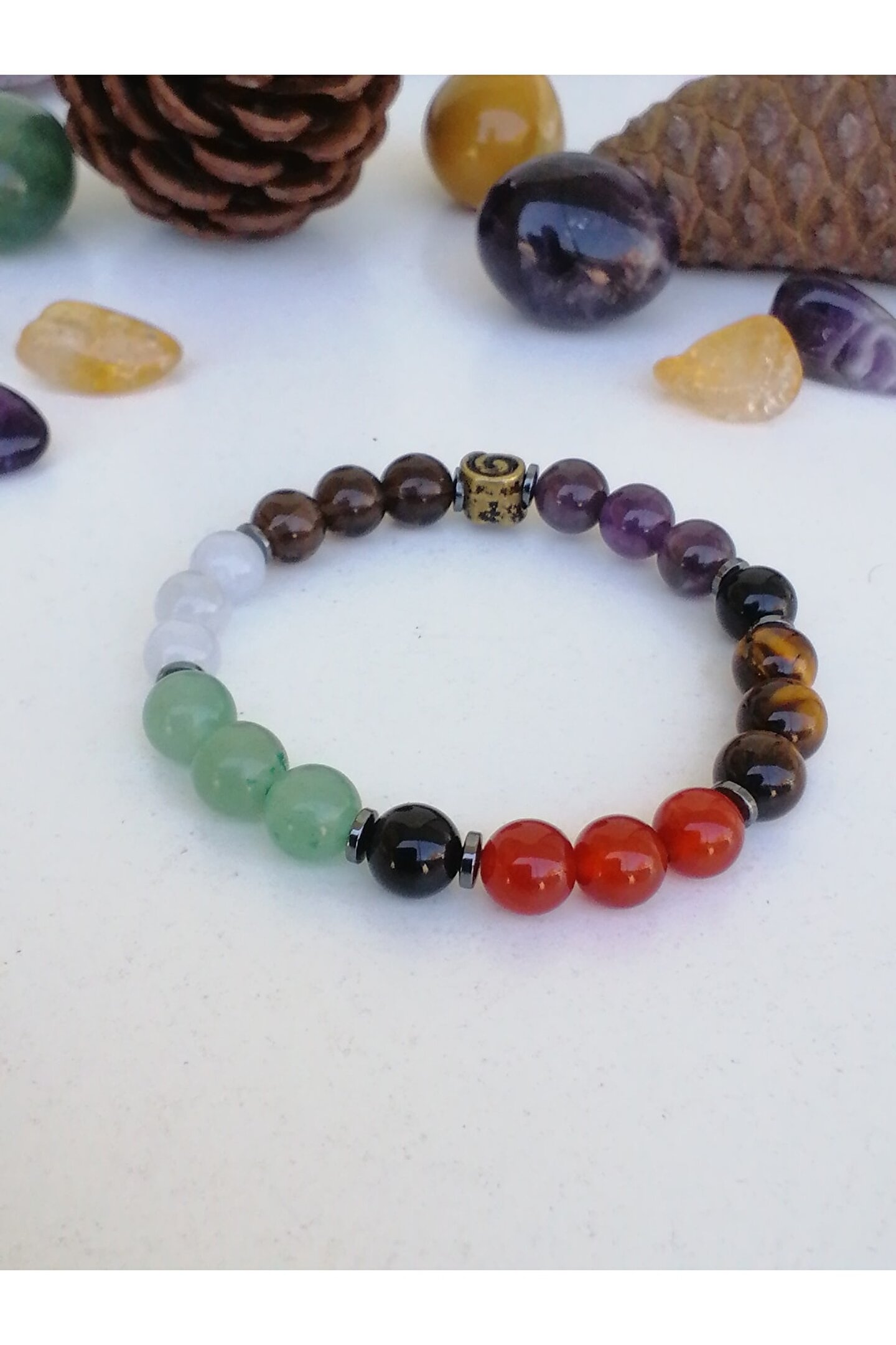 - Doğal taşların eşsiz güzelliğini yansıtan bu bileklik, gençlerin enerjisini ve stilini tamamlar; - Oniks, aventurin, kuvars, akuamarin, kalsedon ve akik gibi farklı türdeki taşlarla zenginleştirilmiş tasarım, her bir bilekliği benzersiz kılar; - Gençlerin başarıya giden yolda yanlarında taşıyabilecekleri bu bileklik, hem şıklığı hem de pozitif enerjiyi temsil eder; - Taş materyali sayesinde uzun ömürlü kullanım sunar ve doğal dokusuyla dikkat çeker;