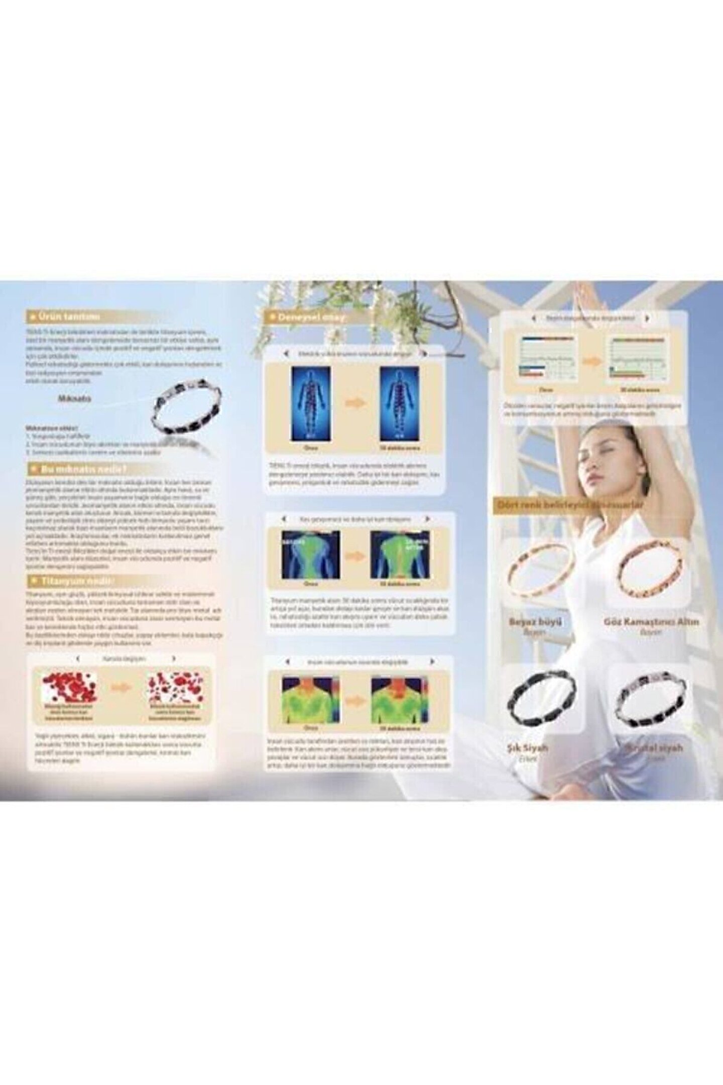 Bilgisayar ve cep telefonlarından radyasyona maruz kalanlar ; Özellikle uzun saatler çalışanlar ve bir masanin başında oturanlar ; Stres altında kalanlar ; Yorgun ve kendini bunalmış er ; Uykusu iyi olmayanlar ve sağlıksız bir yaşamı tarzını ; Egrersiz sonrası kas gerginliği hissedenler ; TİENS Ti-Enerji bilezikleri mıknatısları ile birlikte titanyum içeren, özel bir manyetik alanı dengelemede benzersiz bir etkiye sahip, ayni zamanda, insan vücudu içinde pozitif ve negatif iyonları dengelemek için çok etkilidirler.; fiziksel rahatsızlığı gidermekte çok etkili, karı dolaşımını hızlarıdırır ve bizi radyasyon ortamından etkili olarak koruyabilir.; Mıknatısın etkisi: Yorgunluğu hafifletir ; İnsan vücudunun biyo-akımları ve manyetik alanını ayarlar ; Serbest radikallerin üretim ve etkilerini azaitır ; Bu mıknatıs nedir? Dünyanın kendisi dev bir mıknatıs olduğu bilinir.; İnsan her zaman Jeomanyetik alanın etkisi altında bulunmaktadır.; Aynı hava, su ve güneş gibi, yerçekimi insan yaşamının bağlı olduğu en önemli unsurlardan biridir.; Jeomanyetik alanın etkisi altında, insan vücudu kendi manyetik aları oluşturur.; Ancak, küresel ortamda değişiklikler, yaşam ve psikolojik stres düzeyi yüksek hizli tempolu yaşam tarzi kaçınılmaz olarak bazı insanların manyetik alanında belli bozukluklara yol açmaktadır.; Araştırmacılar, ek mıknatısların kullanılması genel refahını artırmakta olduğunu buldu.; Tlens'in Ti-enerji Bilezikler doğal enerji le oldukça etkin bir mıknatıs içerir.; Manyetik alanı düzenler, insan vücudunda pozitif ve negatif iyonlar dengesini sağlayabilir.; Titanyum nedir? Titanyum, aşırı güçlü, yüksek kimyasal istikrar sahibi ve mükemmel biyouyumluluğu olan, insan vücuduna tamamen nötr olan ve alerjiye neden olmayan tek metaldir.; Tıp alanında pro- biyo-metal adı verilmiştir.; Toksik olmayan, insan vücuduna zarar vermeyen bu metal kas ve kemiklerde hiçbir etki göstermez.; Bu özelliklerinden dolayi tıbbi cihazlar, yapay eklemler, kalp kapakçığı ve diş implant gibilerde yaygın kullanımı var.; Kanda değişim ; Yağlı yiyecekler, alkol, sigara - bütün bunlar kan viskozitesini artırabilir.; TTENS Ti-Enerji bilezik kullandıktan sonra vücutta pozitif iyonlar ve negatif iyonlar dengelenir, kırmızı kan hücreleri dağılır.; Beyin dalgalarında değişiklikler Önce 30 dakika sonra Ölçülen sonuçlar, negatif iyanlar beyin dalgalarını geliştirdiğini ve konsantrasyonun artmış olduğunu göstermektedir.; TİENS Ti-enerji bilezik, insan vücudunda elektrik akımını dengelemeye yardımcı olabilir.; Daha iyi bir karı dolaşımı, kas gevşemesi, yorgunluk ve rahatsızlık gidermeyi sağlar.; ; Kasgevşemesi ve dahaiyi kandolaşımı Titanyum manyetik alanı 30 dakika sonra vücut sıcaklığında bir artışa yol açar, bundan dolajı kaslar gevşer ve kan düzgün akar.; Isı, rahatsızlığı azaltır karı akışını uyarir ve vücudun daha çabuk toksinleri ortadan kaldırması için izin verir.; ; İnsan vücudu tarafından üretilen isi miktarı, kan akışının hazı ile belirlenir.; Kan akımı artar, vücüt ısısı yükseliyor we tersi-kan akışı yavaşlar ve vücut işisi düşer.; Burada gösterileri sonuçlar, sıcaklık artışı, daha iyi bir kan dolaşımına bağlı olduğunu göstermektedir.; ;