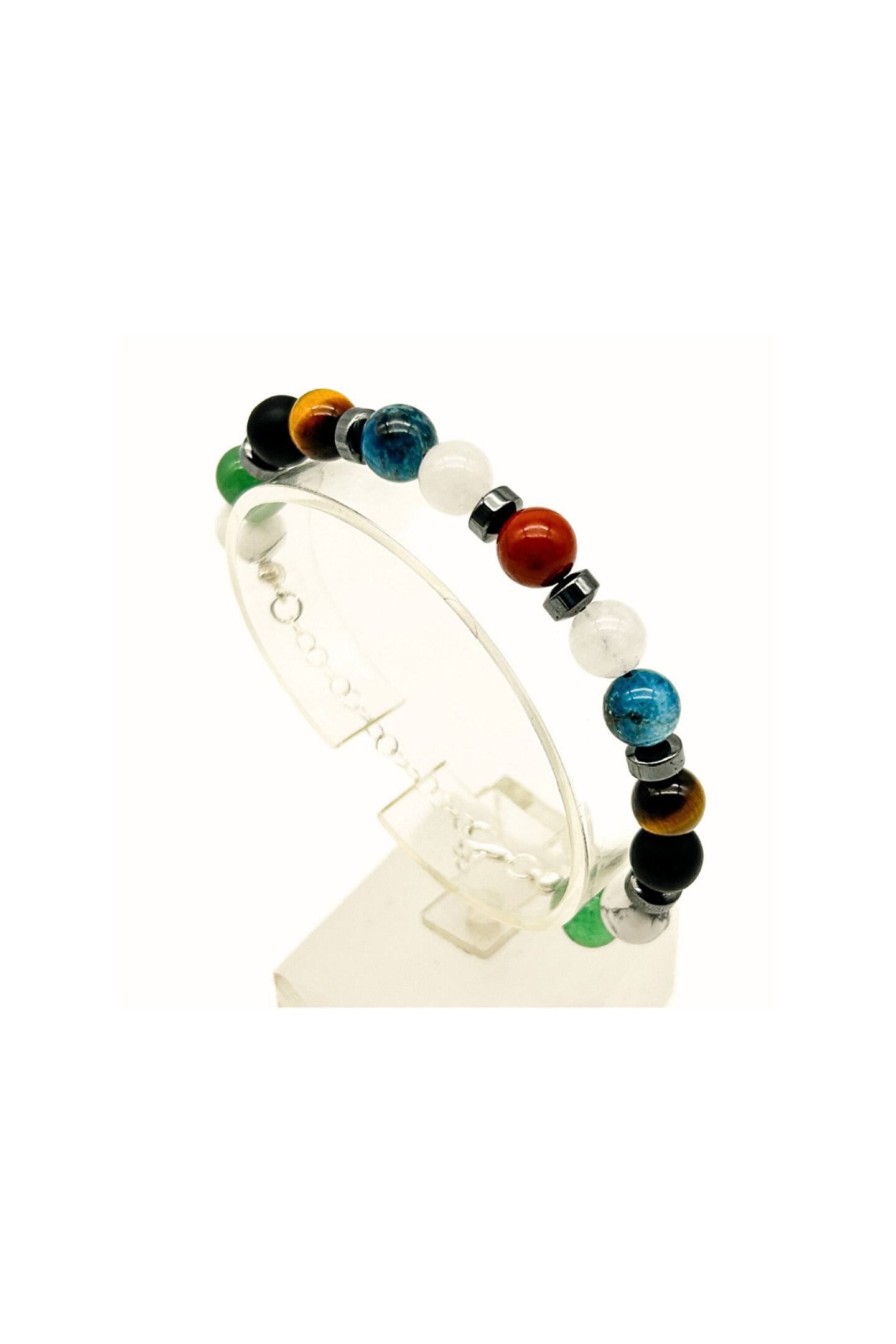 Zayıflama ve İştah Kesme Gümüş Bileklik.; 925 Ayar Gümüş Zincir ve Kilit Kullanılmıştır.; ; ; Orijinal doğal taşlar: Apatit, Ay taşı, Kırmızı Jasper, Oniks, Havlit, Aventurin, Kaplangözü, Hematit.; ; ; Bileklik, ayarlanabilirdir ve 15-20 cm bilek ölçüsüne uygundur.; ; ; Bilekliğin Özellikleri: Metabolizma hızlandırma ve yağ yakımı, Tokluk hissi ve iştah azalması, İştah kapatma ve kesici, Alışkanlık bırakma, Stres, Depresyon ve uykusuzluk, Nazar, Kaygı ve korku yenme, Migren ve ağrı azaltma, Kemik ve Cilt Sağlığı.; ; Bileklik de kullanılan doğal taşlar, iştah keserek, alışkanlıkları bırakmayı sağlayacak enerjilerle birlikte metabolizma hızını yükselterek, yağ yakımı ve kilo vermeye neden olur.; ; Kullanım Bilgisi Ürün İle Birlikte Gönderilmektedir.