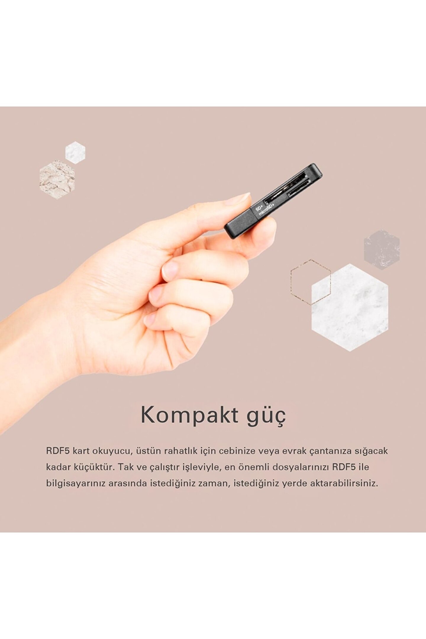 Resmi distribütör garantisi ile güvenli alışverişin keyfini çıkarın; Ts; rdf5k sd/microsd usb 3; 1 kart okuyucu, 2 yıl süreyle güvence altına alınmıştır; USB 3; 1 teknolojisi sayesinde yüksek hızda veri aktarımı gerçekleştirin; kart okuyucu, hızlı ve etkili bir şekilde dosya transferi yapmanızı sağlar; Siyah renk seçeneğiyle şık ve modern bir tasarıma sahip olan bu kart okuyucu, cihazınıza estetik bir uyum sağlar; MicroSD ve SD kart desteği ile geniş uyumluluk sunar; farklı hafıza kart türleriyle uyumlu çalışarak çeşitli medya dosyalarını kolayca aktarmanızı mümkün kılar;