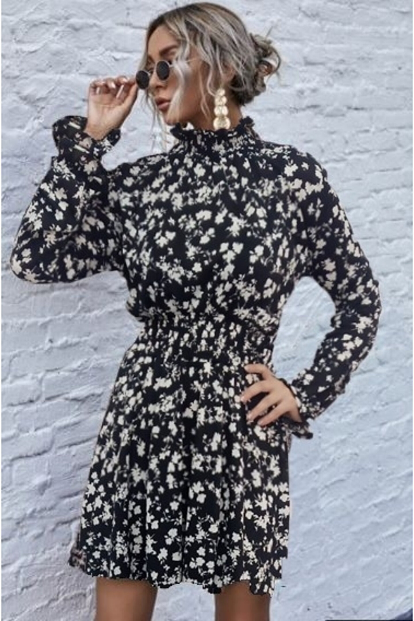 trend_ermege EGECEN Kadın Uzun Kollu Balıkçı Yaka çiçek Baskılı Helen Kumaş Elbise