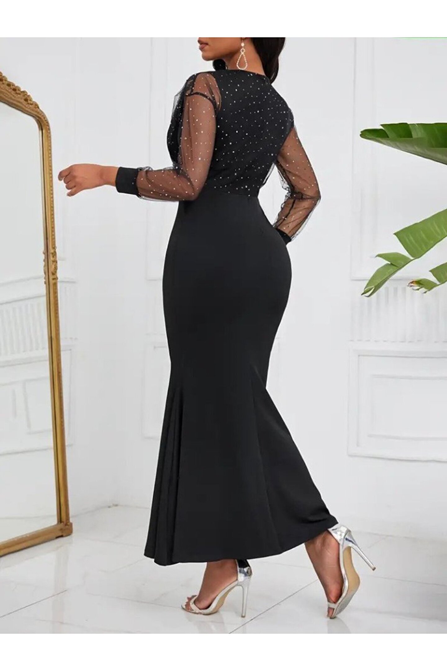 trend_ermege EQURİ Kadın Uzun Kollu Kruvaze Yakalı Taş Ve Tül Detaylı Uzun Ithal Krep Elbise