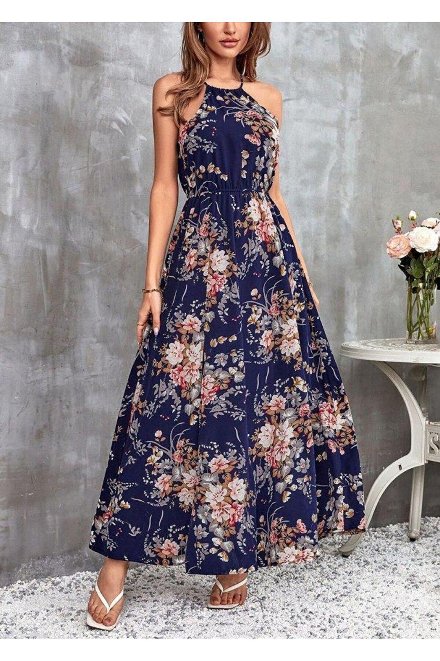 trend_ermege Kadın Açık Omuz Halter Yaka Beli Lastikli Büzgü Detay önden Yırtmaçlı çiçek Desenli Süprem Elbise