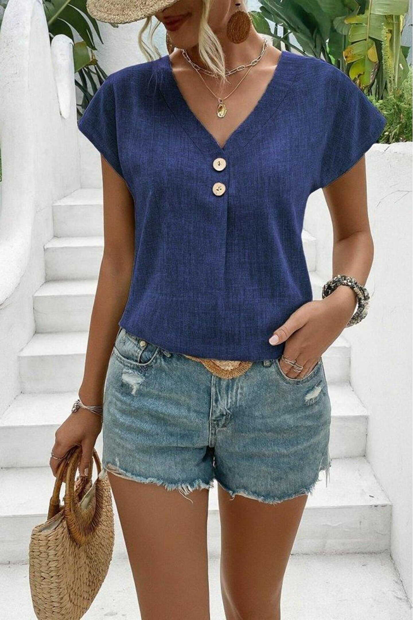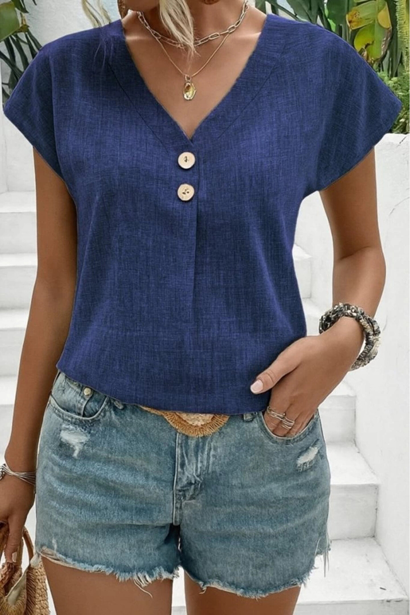 Kadın Kısa Kollu V Yakalı Düğmeli Keten Bluz