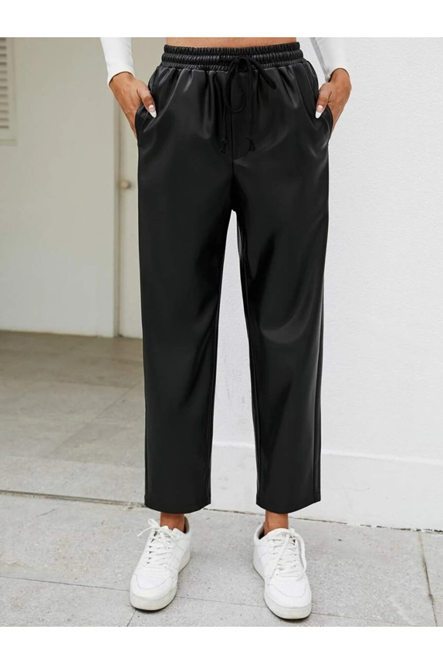 trend_ermege Kadın Yüksel Bel Bağcıklı Deri Pantolon