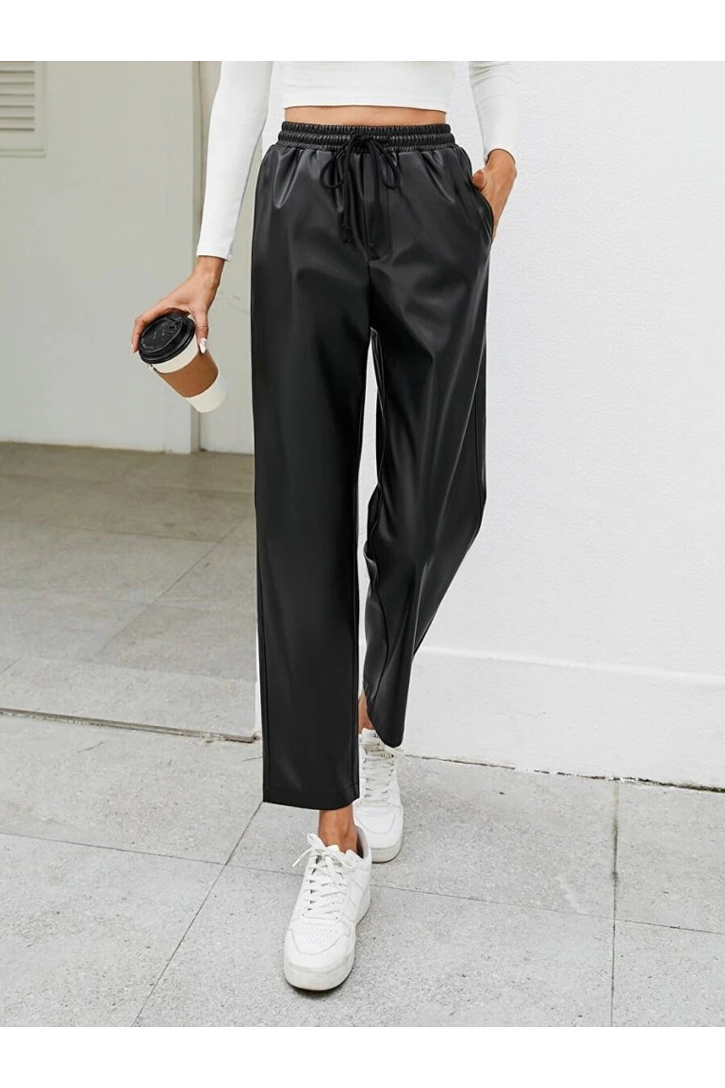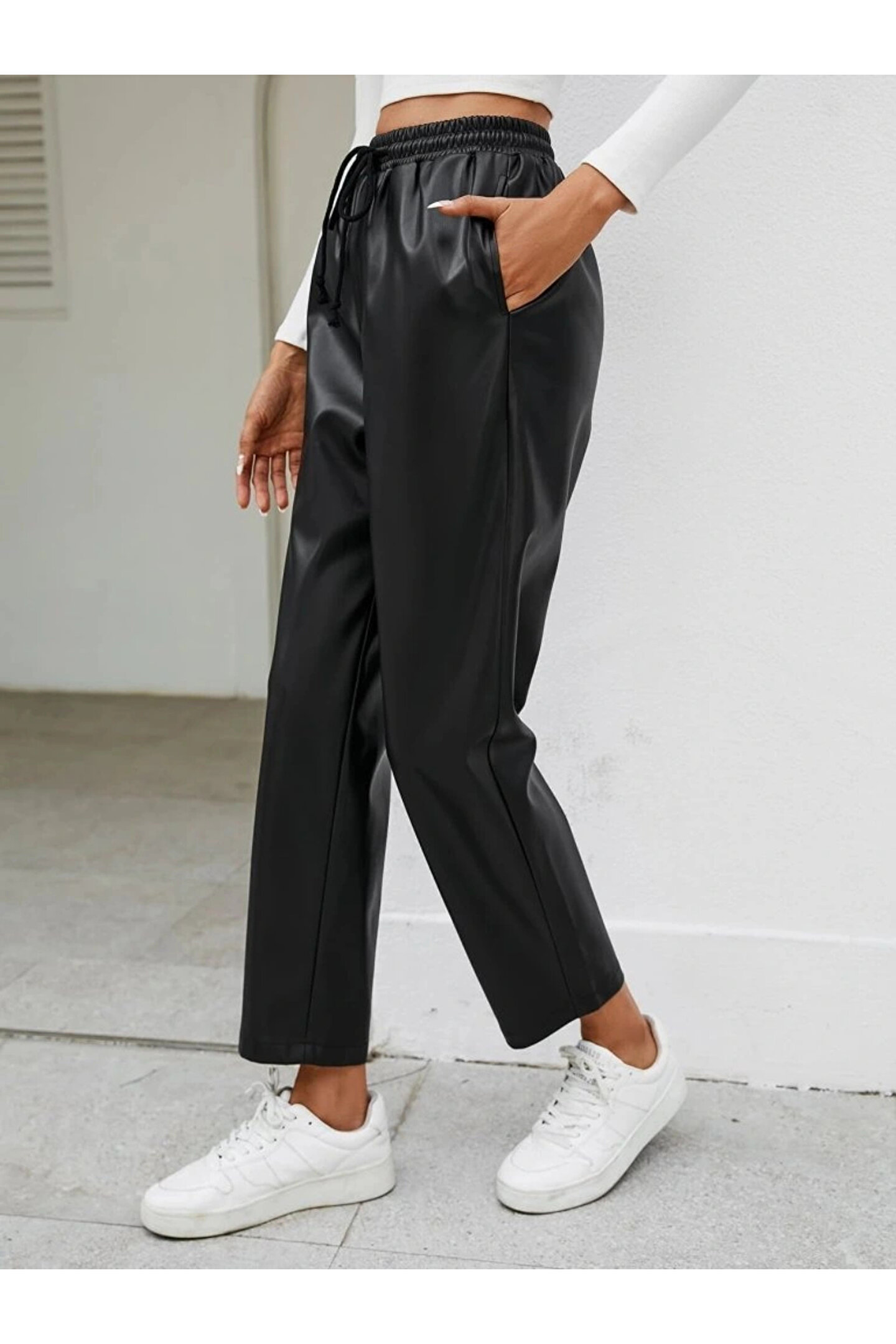 Kadın Yüksel Bel Bağcıklı Deri Pantolon