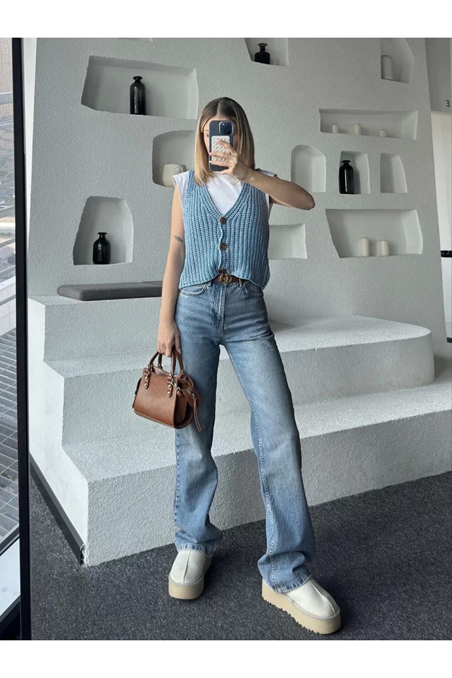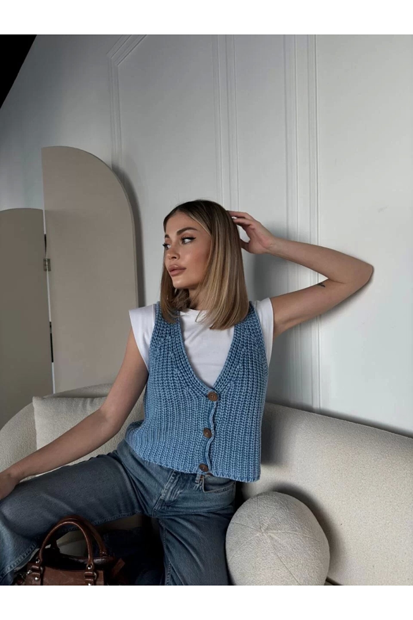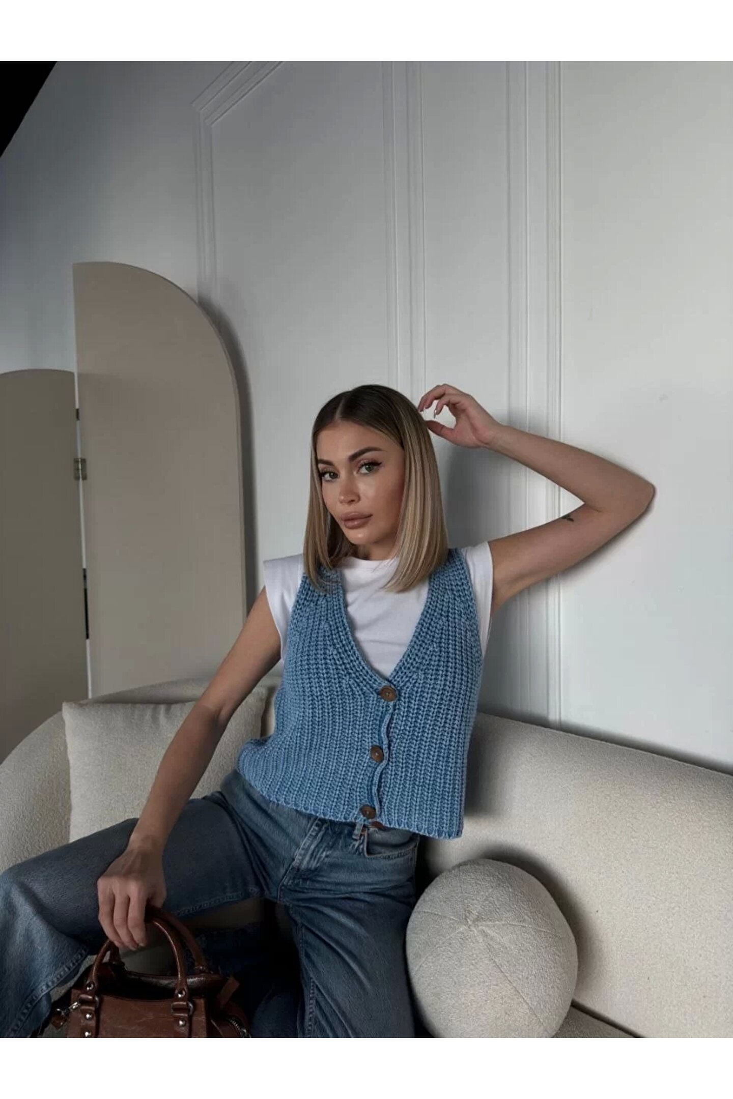 Triko Kolsuz Düğmeli Yelek - Mavi