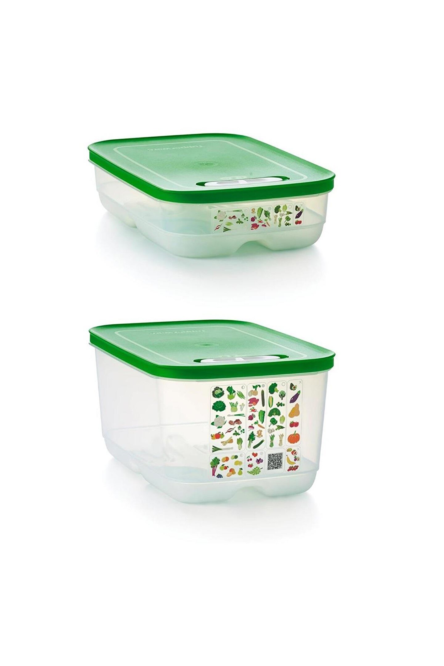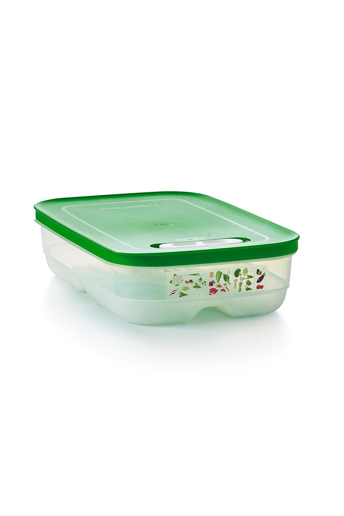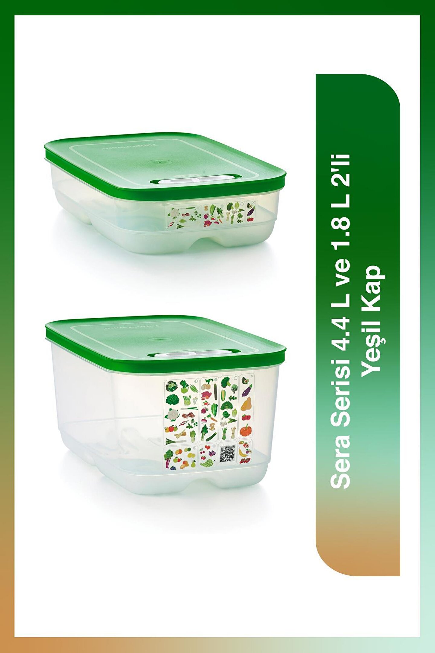Ürünlerinizi daha uzun süre taze tutun! Meyve ve sebzelerin depolanması, bir dizi akıllı kap geliştirmek için Florida Üniversitesi ve Tupperware'in en iyi gıda bilimcileri tarafından kapsamlı bir şekilde araştırıldı.; Tupperware AKO (Atmosfer Kontrollü Ortam) sistemi, meyve ve sebzeleri daha uzun süre taze tutmak için en uygun ortamı yaratır.; Sera Serisi Kaplar, içeri giren oksijen akışını ve dışarı çıkan karbondioksiti dengeleyerek konteyner içindeki atmosferi düzenlemeye yardımcı olan özel bir üç yollu havalandırma sistemine sahiptir.; Kapağın üstünde yer alan kaydırıcı mekanizma 3 farklı pozisyonda kullanılabilir: 1- Yarım Açık: Kaydırıcı mekanizma, piktogramdaki yarım daire ile hizalandığında, contadaki küçük açıklık hafif havalandırma için açılır.; 2- Kapalı: Kaydırıcı mekanizma, piktogramın ortasındaki tamamen oyulmuş daire ile hizalandığında, contadaki her iki açıklık da kapatılır.; 3- Tam Açık: Kaydırıcı mekanizma, piktogram üzerindeki içi boş, parlak daire ile hizalandığında, contadaki büyük açıklık tam havalandırma için açılır.; Köşedeki tırnak sayesinde kapağın açılması kolaydır.; Tabanın altındaki yerleşik ızgara, içindekileri nemden uzak tutar ve yiyeceklerin etrafında hava sirkülasyonu sağlar.; Kullanılmadığı zaman, farklı boyutlar arasında bile kompakt depolama için yuvalanabilirler.; -4.4 L kapasiteli Sera Serisi Yüksek Gövdeli Kap, aşağıdaki gibi meyve ve sebzeleri saklayabilir: Elma, enginar, pancar, dolmalık biber, brokoli, havuç, karnabahar, kereviz, turunçgiller, hindiba, rezene, marul, kırmızı biber, armut, bezelye, biber, ıspanak, tatlı patates, şalgam, kabak… -1.8 L kapasiteli Sera Serisi Kısa Gövdeli Kap, aşağıdaki gibi meyve ve sebzeleri saklayabilir: Kuşkonmaz, pancar, yaban mersini, Brüksel lahanası, havuç, kereviz, kiraz, biber, incir, taze otlar, zencefil, yeşil fasulye, enginar, alabaşlar, pırasa, limon veya misket limonu, mantar, bezelye, turp , ahududu, taze soğan, çilek, şalgam, beyaz/kırmızı üzüm, kabak.