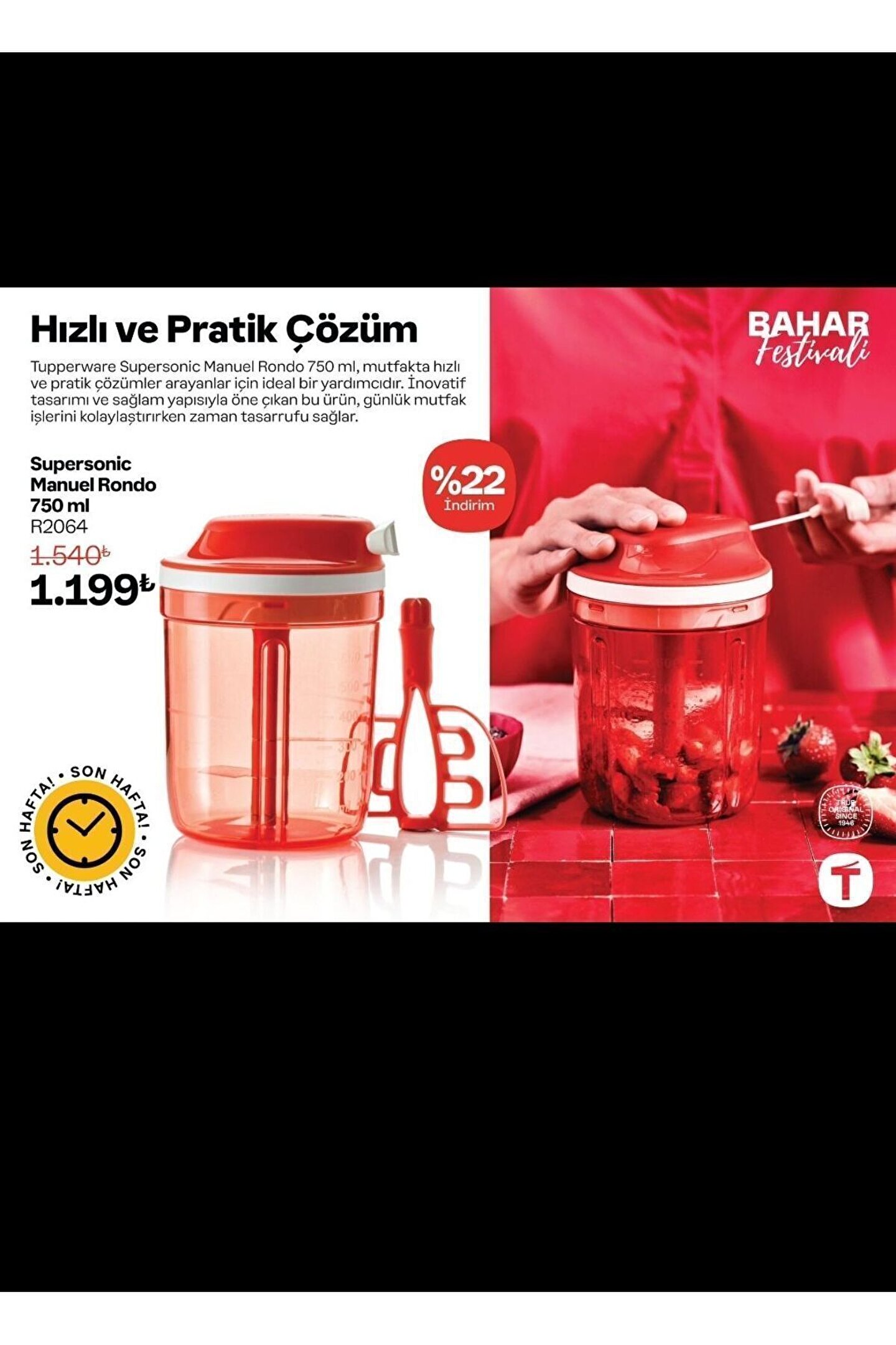 - Yüksek kaliteli plastik malzemeden üretilmiştir, uzun ömürlü kullanım sunar.; - Canlı kırmızı rengiyle mutfağınıza modern bir dokunuş katar.; - Tek ebat tasarımı sayesinde çeşitli kapaklarla uyumlu kullanım imkanı sağlar.; - Gıda ile temas güvenlidir, güvenle kullanabilirsiniz.; - Gıda temas sembolü ile belirlenmiş olup, gıda güvenliği standartlarına uygundur.; - ABD menşeili olup, tupperware kalitesini mutfağınıza taşır.; - Tupperware tarafından üretilmiş olup, marka güvencesiyle sunulmaktadır.