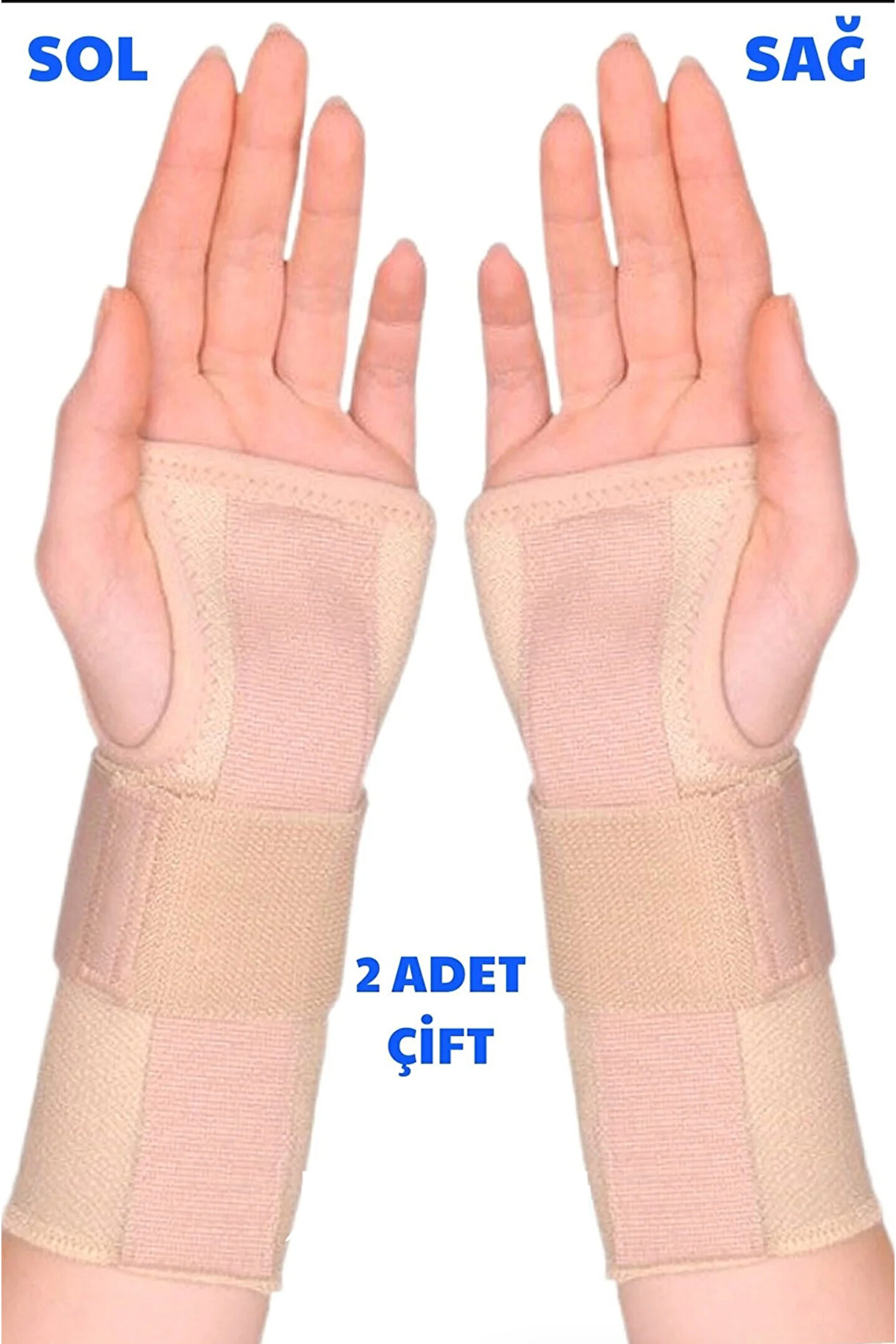 Çift el bilek ateli bedensiz (krem renk) (1 adet sağ-1 adet sol) El bilek ateli bedensiz sağ el (krem renk) - Terletmeyen hava alabilen kumaştan üretildiğinden kullanım sırasında hastaya rahatsızlık vermez. ; Bilek istirahatini gerektiren bütün durumlarda, incinme ve burkulmalarda kırık sekeli ağrıları ve alçı sonrası için kullanılır. ; Ergonomik alüminyum avuç içi desteği ile bileği saran elastik bandajı sayesinde bileğin stabilizasyonunu sağlar. ; Kullanım sürecinde hastanın rahatsızlık duymasını önler. ; El bileğinin nötral pozisyonda immobilizasyonunu sağlayan anatomik olarak şekillendirilmiş alüminyum desteği vardır. ; Bilek çevresinde stabilizasyonu arttıran bandajı mevcuttur. ; Endikasyonlar: 1. ; Karpal tünel ve de quervain’in beraber görüldüğü durumlar 2. ; De quervain tenosinoviti 3.El bileğinin ağrılı durumları 4.Post-Op ve travma sonrasıkoruma amaçlı sağ el için uyumludur;