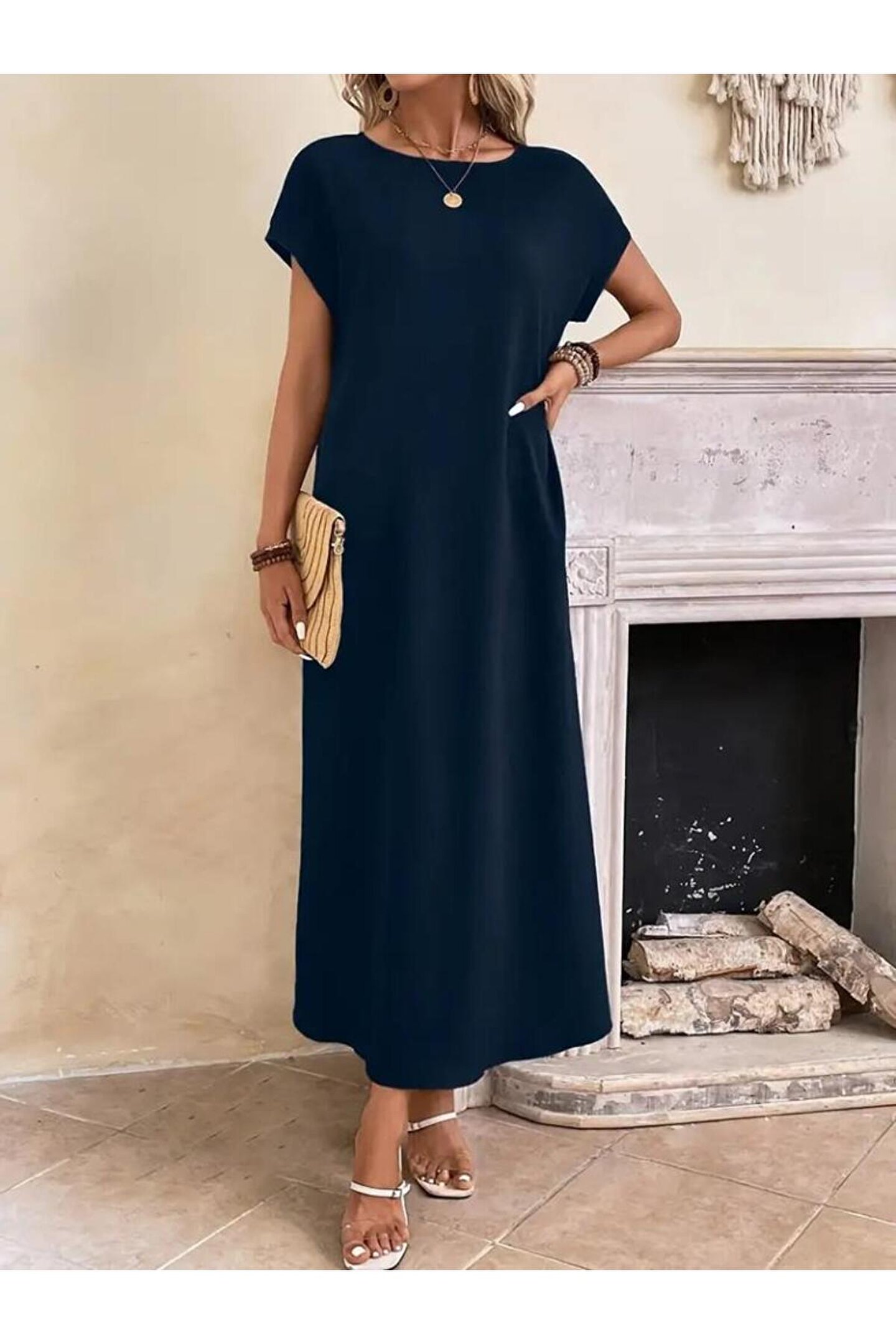 Kadın Uzun Kollu Yakası Açık Viskon Elbise