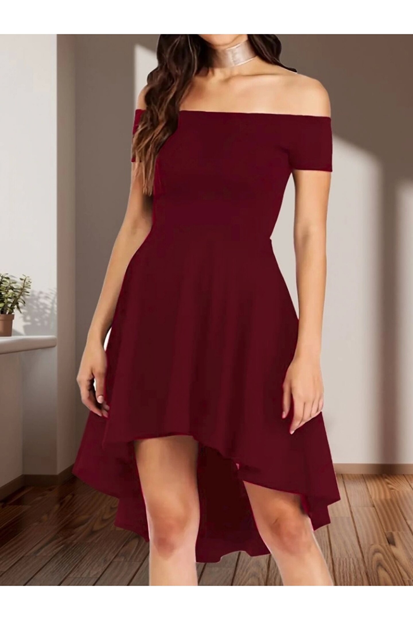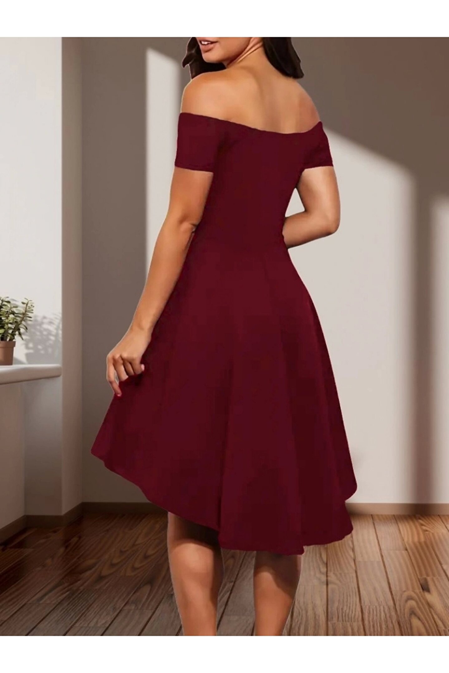 Kadın Kısa Kollu Madonna Yaka önü Kısa Arkası Uzun Ithal Krep Elbise