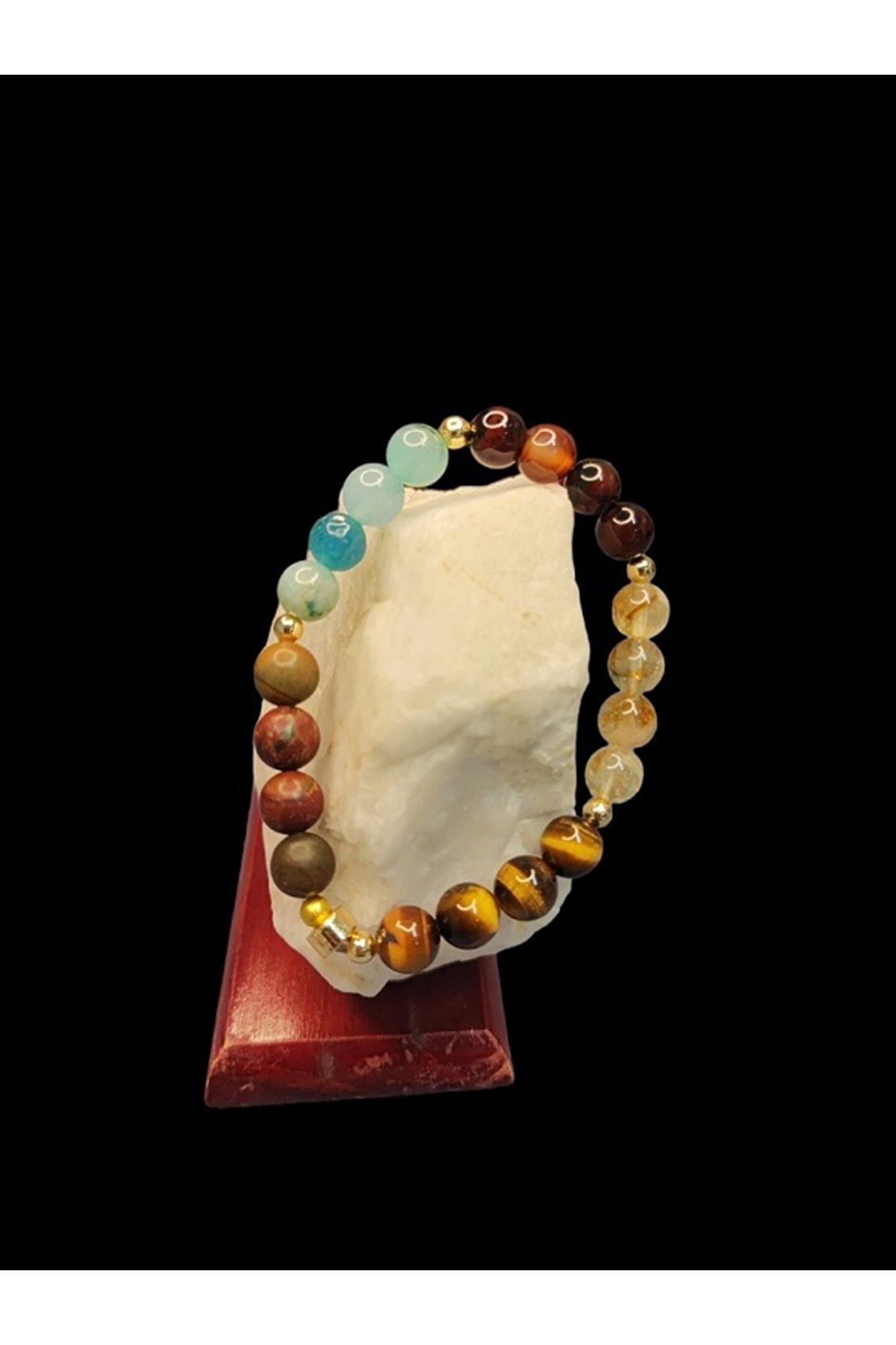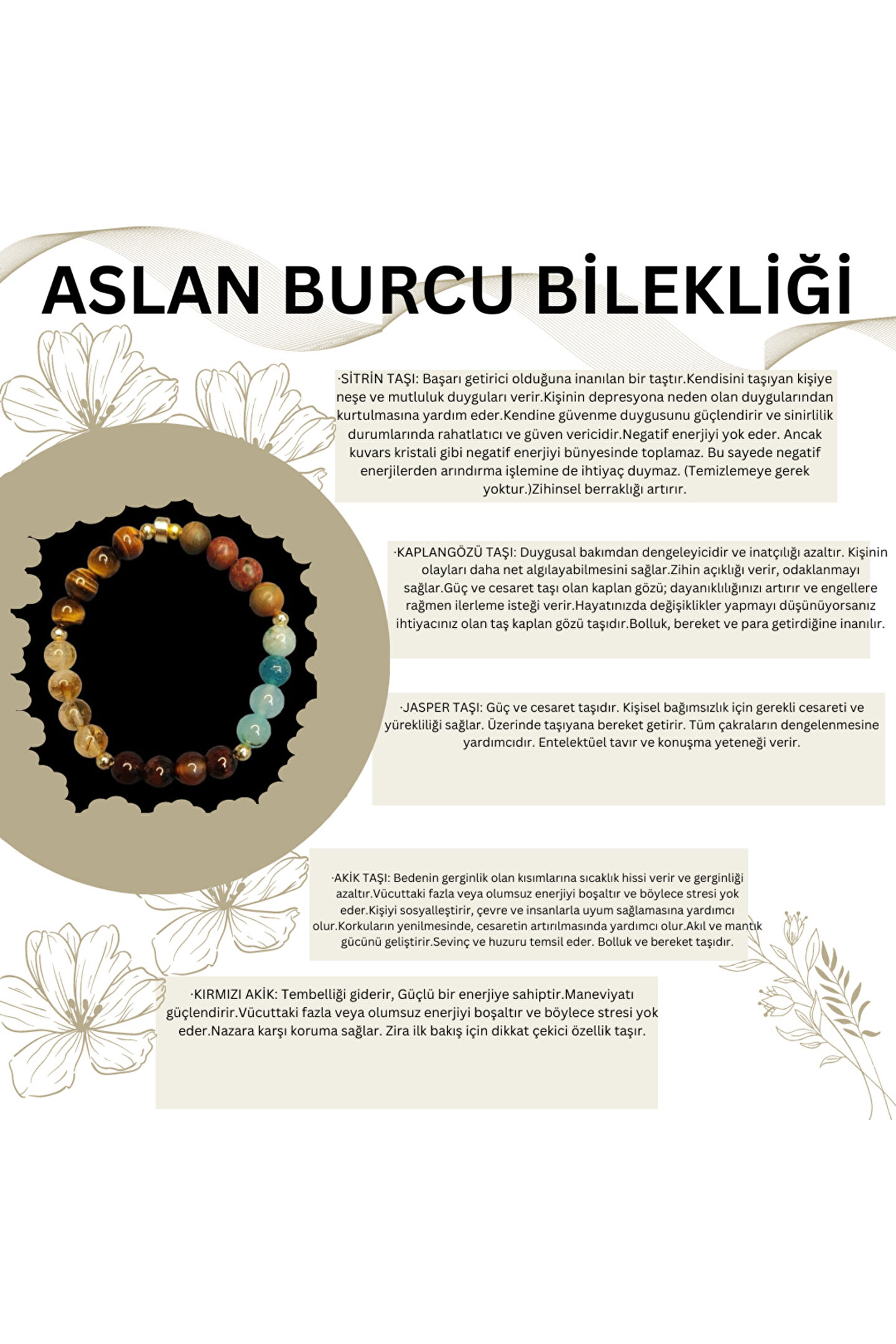 Doğal taş kullanımı sayesinde her bileklik benzersiz ve otantik bir görünüm sunar; Aslan burcu bileklik, aslan burcu özelliklerini yansıtan tasarımıyla dikkat çeker; Doğal taş materyali ile hem şıklığı hem de doğallığı bir arada sunar;