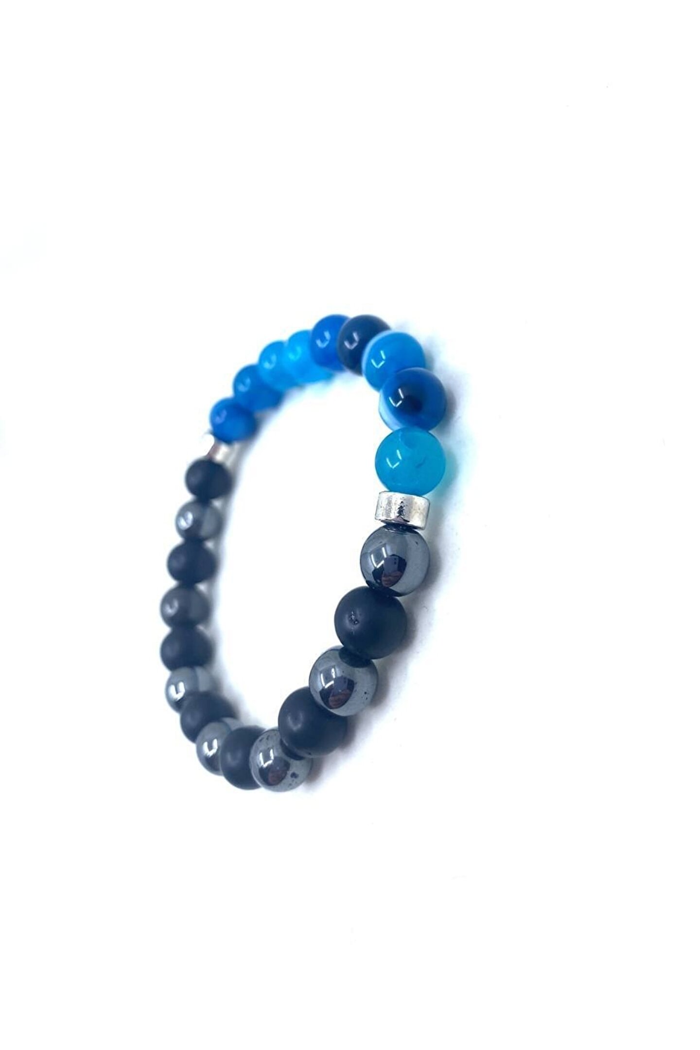 Doğal akik, hematit ve oniks taşlarından oluşan bu bileklik, her bir bileklikte benzersiz desenler ve renk tonları sunar; Doğal taş kullanımı sayesinde, her bileklik eşsiz bir karaktere sahip olup, doğanın güzelliklerini parmaklarınıza taşır; Mavi akik taşı ile hem şıklığı hem de zarafeti bir arada sunarken, hematit taşı ile enerjiyi yansıtır ve pozitif bir etki sağlar; Oniks taşı ise dayanıklılığı ve parlaklığı ile dikkat çeker, uzun süreli kullanım için idealdir; El yapımı ve özgün tasarımıyla dikkat çeken bu bileklik, hem günlük kullanım hem de özel günler için mükemmel bir aksesuar seçeneği sunar;