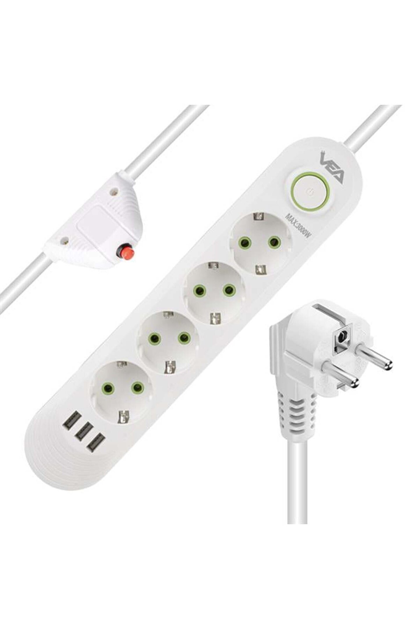 4 Priz ve 3 USB Çıkışı: Vea VA-21560, dört adet priz ve üç adet USB çıkışı ile donatılmıştır, böylece çok sayıda elektronik cihazı aynı anda şarj edebilir veya kullanabilirsiniz. Prizler, geniş aralıklı tasarımı sayesinde farklı priz tiplerine uyum sağlar.