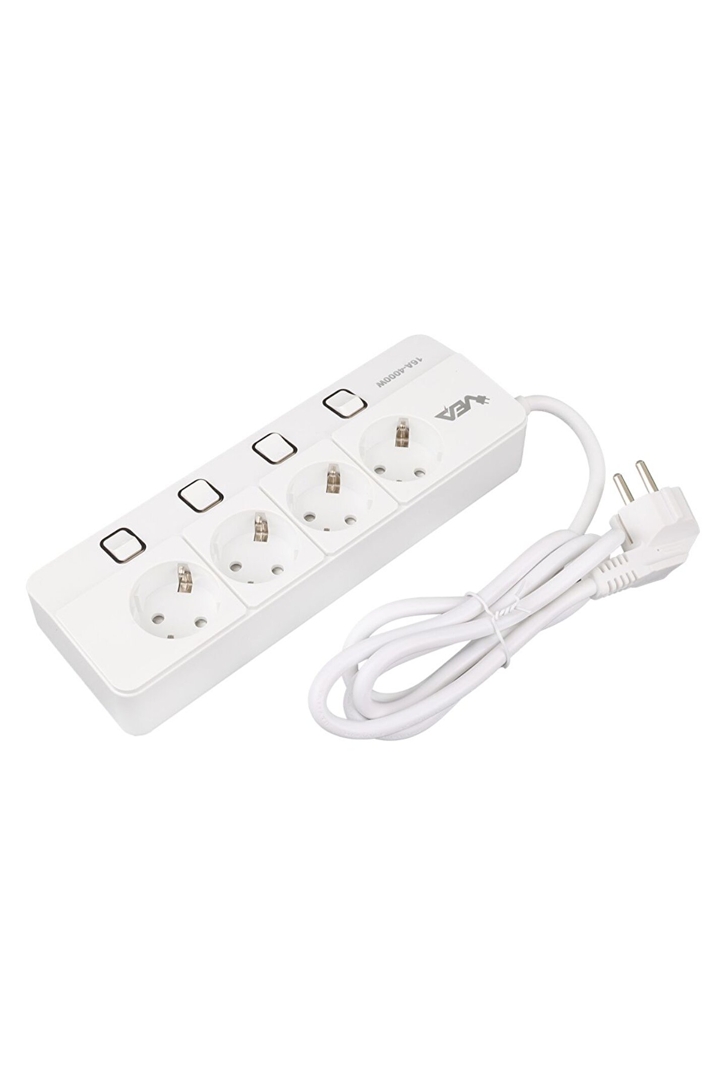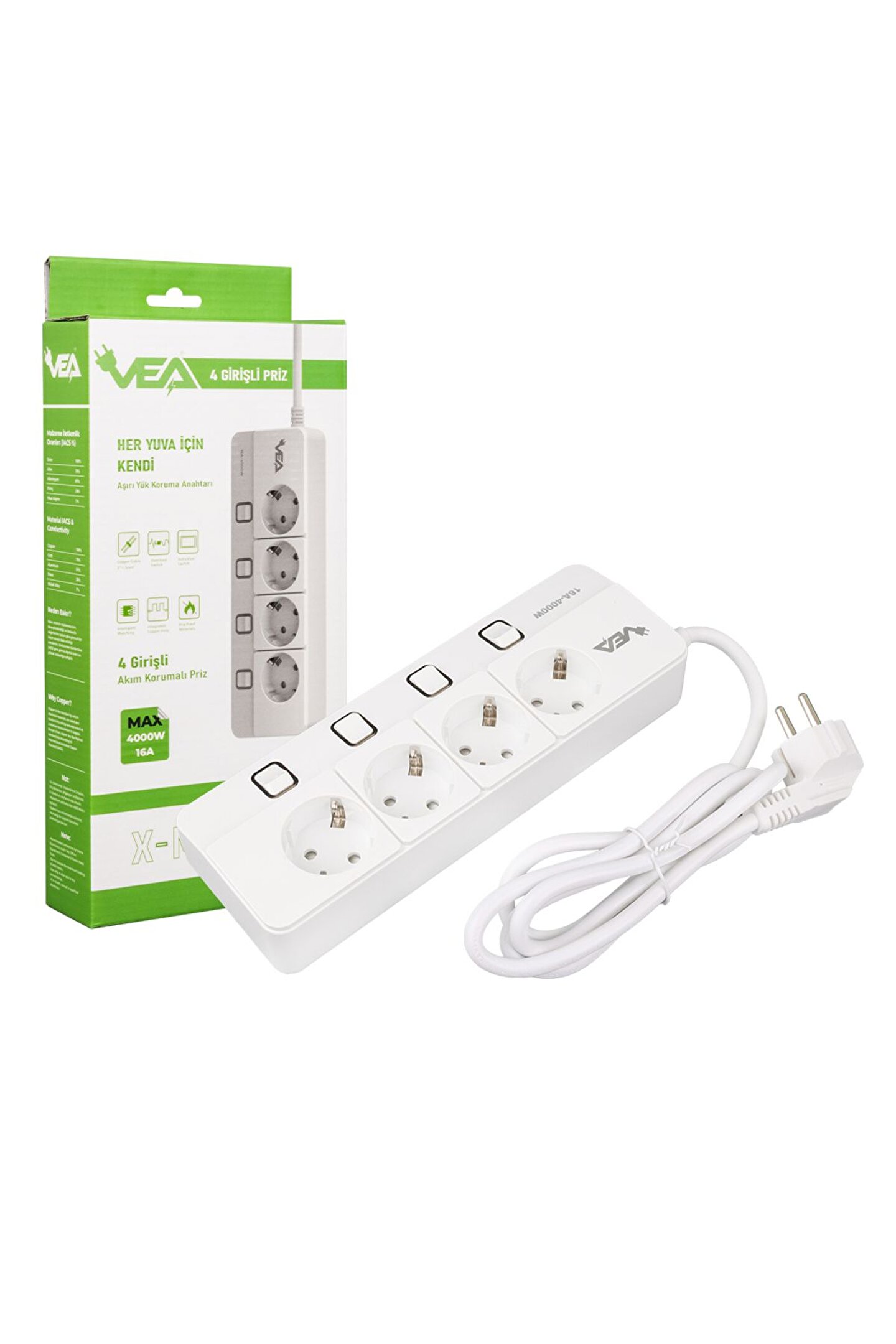 Vea VE-XMAN104 A Class 4'lü Anahtarlı 1.5 Metre Grup Priz Özellikleri Vea VE-XMAN104, güvenliği ve dayanıklılığı bir araya getiren üstün özelliklere sahip bir grup prizdir. Parlak beyaz rengi ve kompakt boyutlarıyla, kullanımı kolay ve estetik bir çözüm sunar. Bu grup priz, 4000 watt gücü ve 16 amper akım kapasitesiyle elektrik ihtiyaçlarınızı karşılamak için ideal bir seçenektir. Ürün Detayları: Akım Koruma Özelliği: Güvenliğinizi ön planda tutan bu grup priz, akım koruma özelliği ile ani akım dalgalanmalarına karşı koruma sağlar. ; Ayrı Anahtarlar ile Kontrol: Her priz girişi için ayrı açma-kapama anahtarı, enerji tasarrufu ve kullanım kolaylığı sağlar. ; Aşırı Isınma Engelleme: İçerdiği aşırı ısınma engelleyici özellik sayesinde, uzun süreli kullanımlarda dahi güvenli bir sunar. ; Dayanıklı Malzeme: Isınmaya karşı dayanıklı malzeme kullanımı, uzun ömürlü ve güvenilir bir ürün sunar. ; Kusursuz Uyumluluk: 3*1.5mm bakır kablo ile donatılan bu grup priz, kusursuz uyumluluk ve güvenilir iletim sağlar. ; Yüksek Kapasiteli Anahtarlar: Her bir priz girişi için ayrı açma-kapama anahtarı, 10.000'den fazla aç-kapa desteği ile günlük kullanıma dayanıklıdır. ; Ürün Boyutu: 240 x 85 x 40 mm boyutlarıyla, kullanımı kolay ve taşınabilir bir yapı sunar. ; İletkenlik Oranları (IACS %): Bakır: %100; Altın: %70; Alüminyum: %61; Pirinç: %28; Nikel Alışımı: %7;