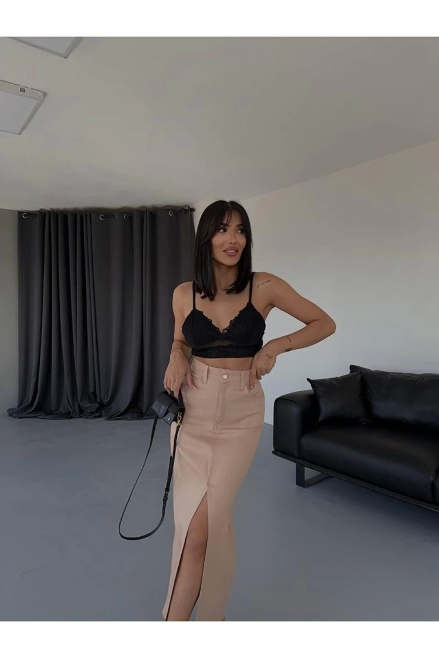 GABARDİN UZUN ÖNDEN YIRTMAÇLI ETEK - Kahverengi