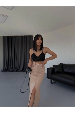 velmorafashion GABARDİN UZUN ÖNDEN YIRTMAÇLI ETEK - Kahverengi
