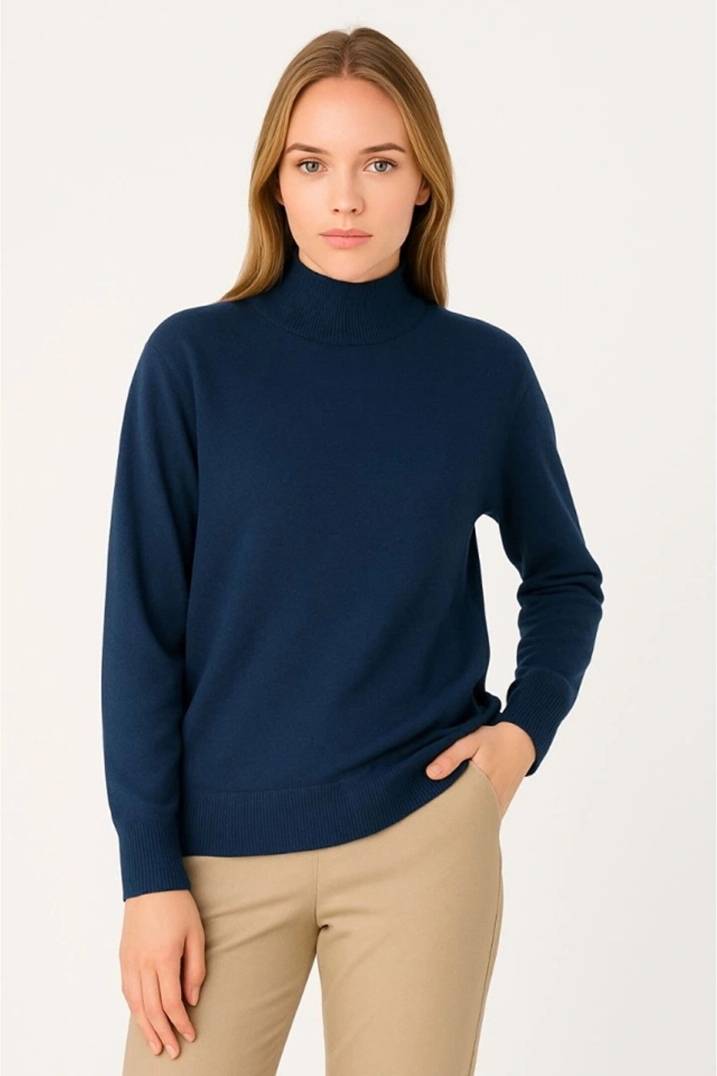 Yarım Boğaz Triko Kazak Yumuşak Dokulu Pamuklu Ince Dokuma, Uzun Kollu Rahat Regular Kalıp - Lacivert