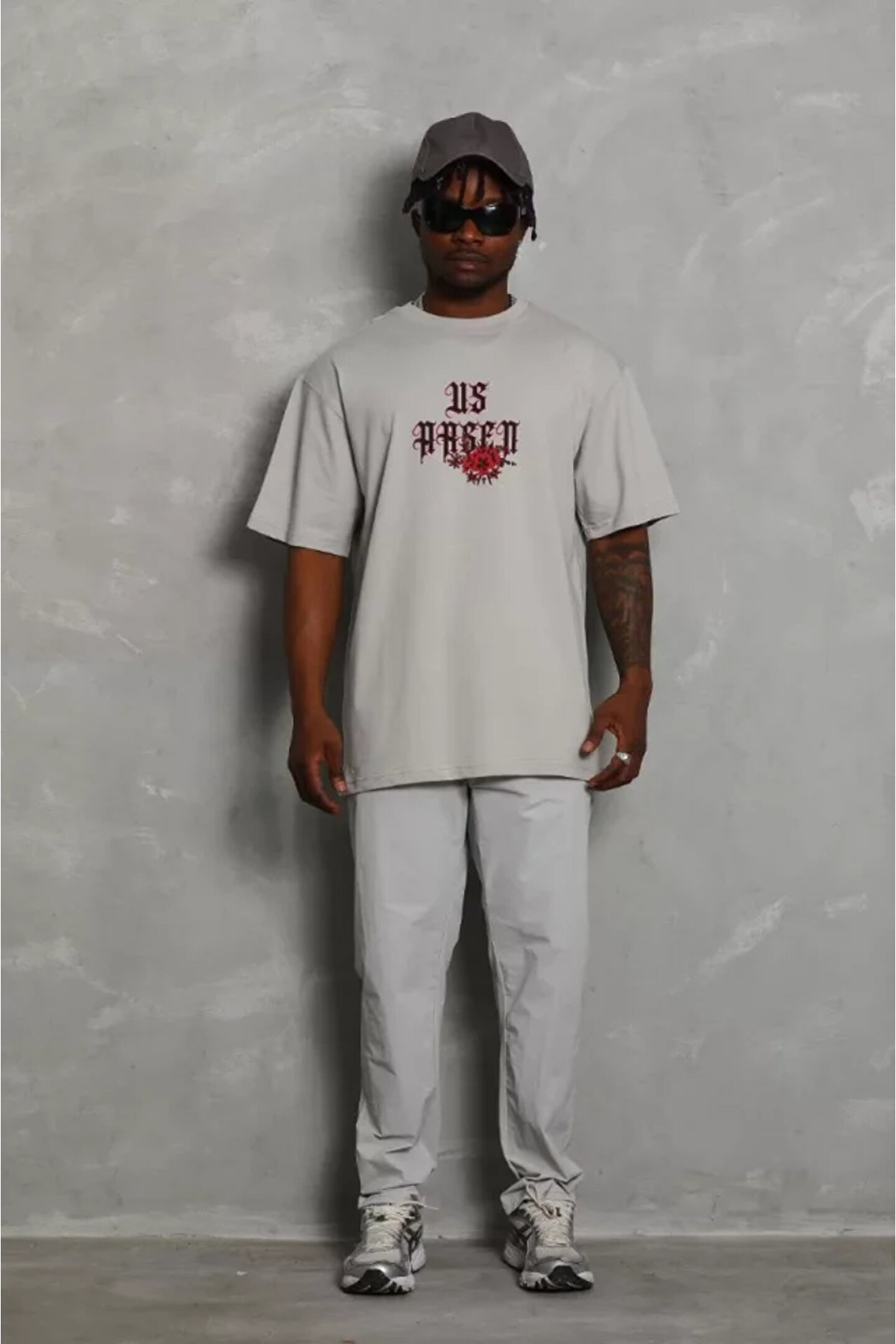 Unisex Oversize Baskılı Bisiklet Yaka T-Shirt - Gri