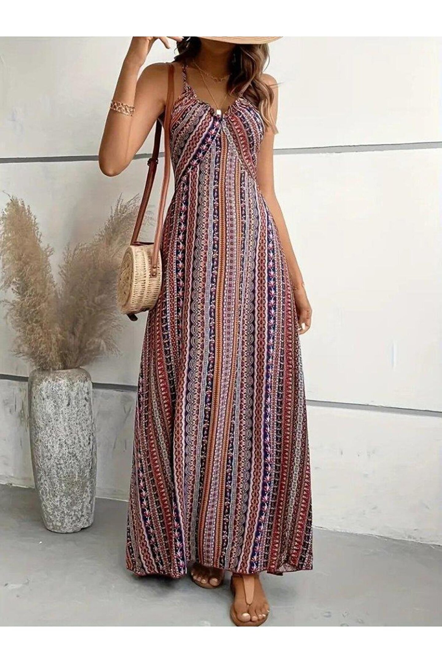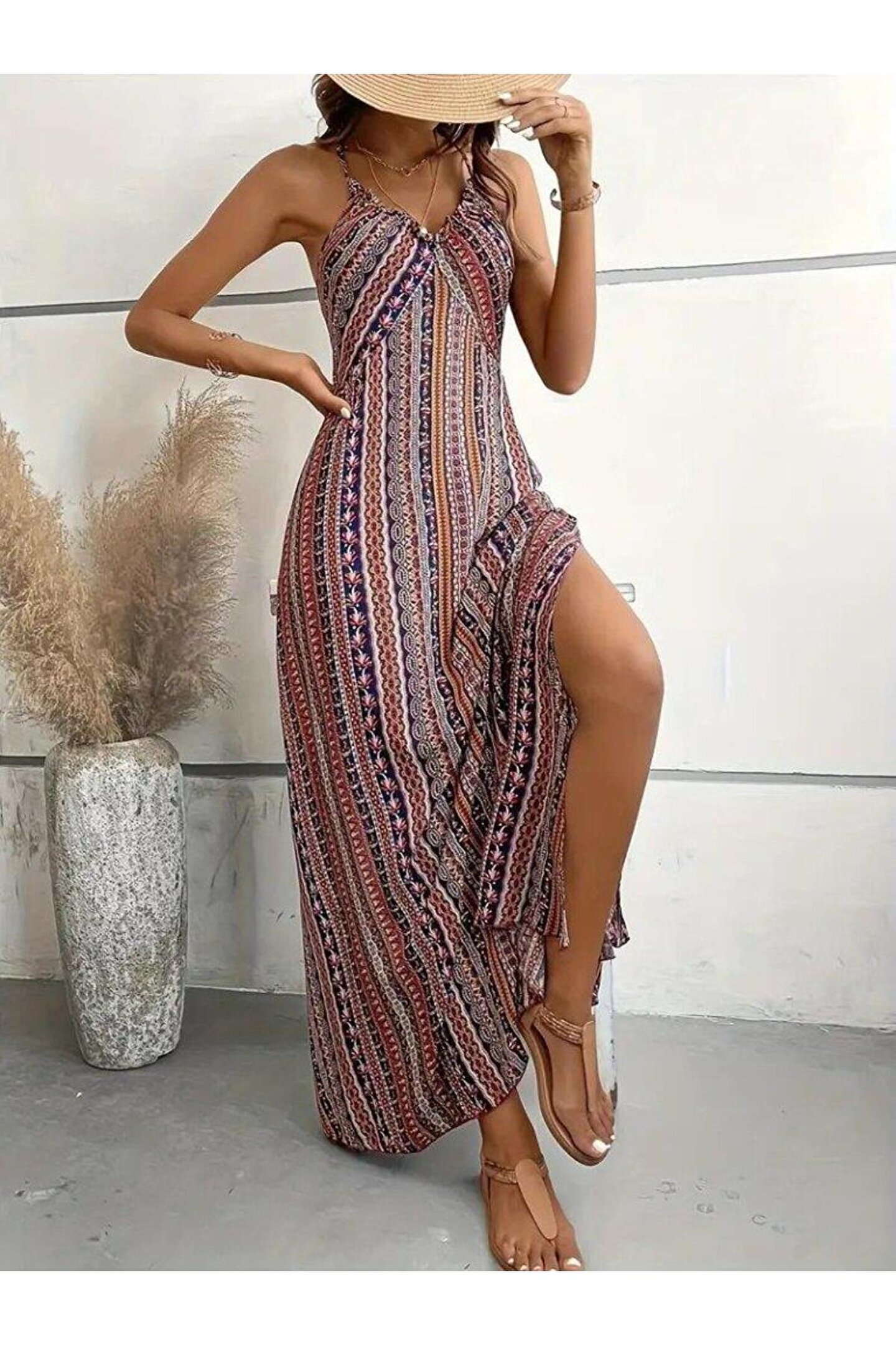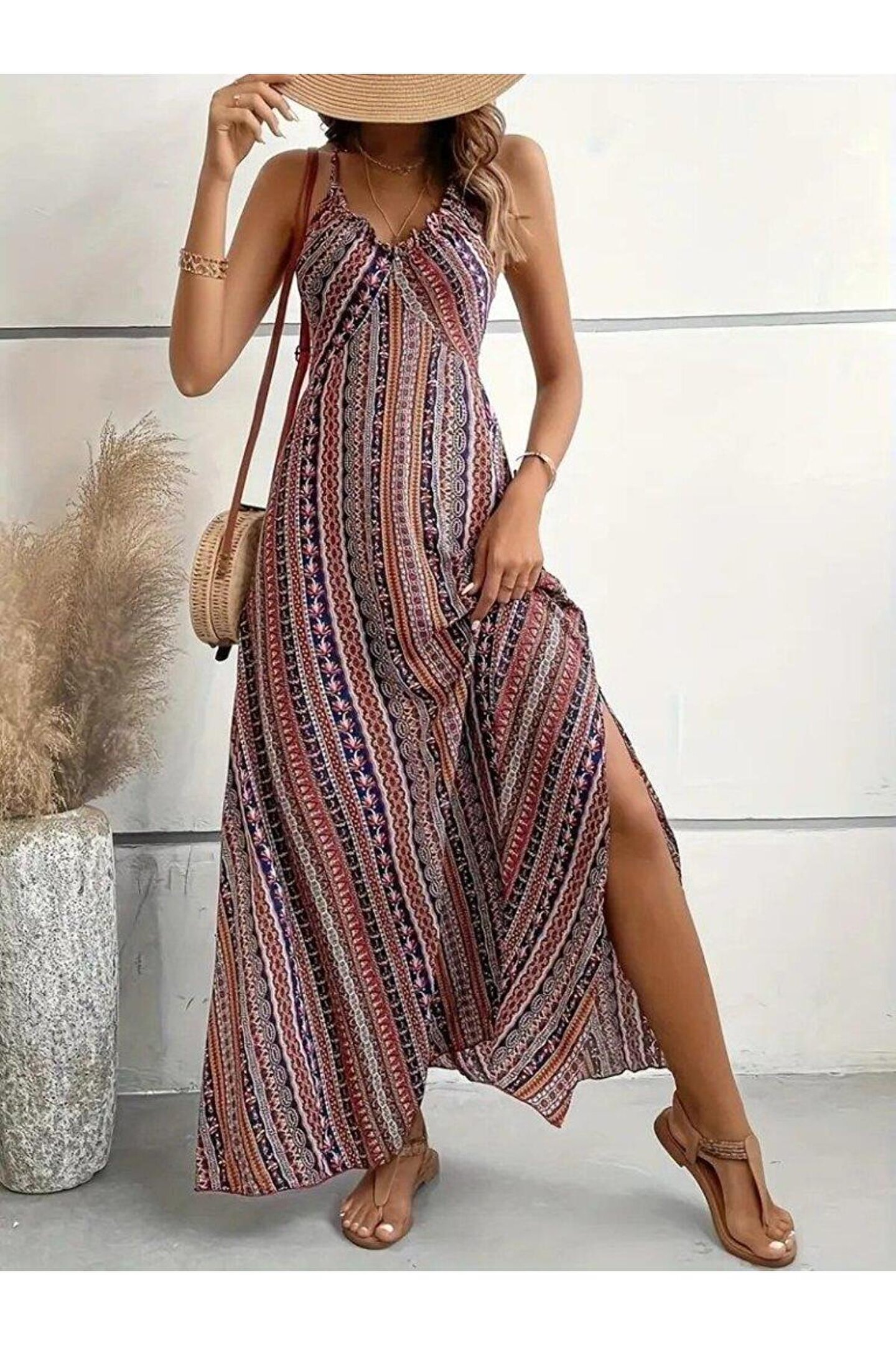 Kadın Ip Askılı Sırttan çapraz Detaylı Yırtmaçlı Desenli Süprem Elbise