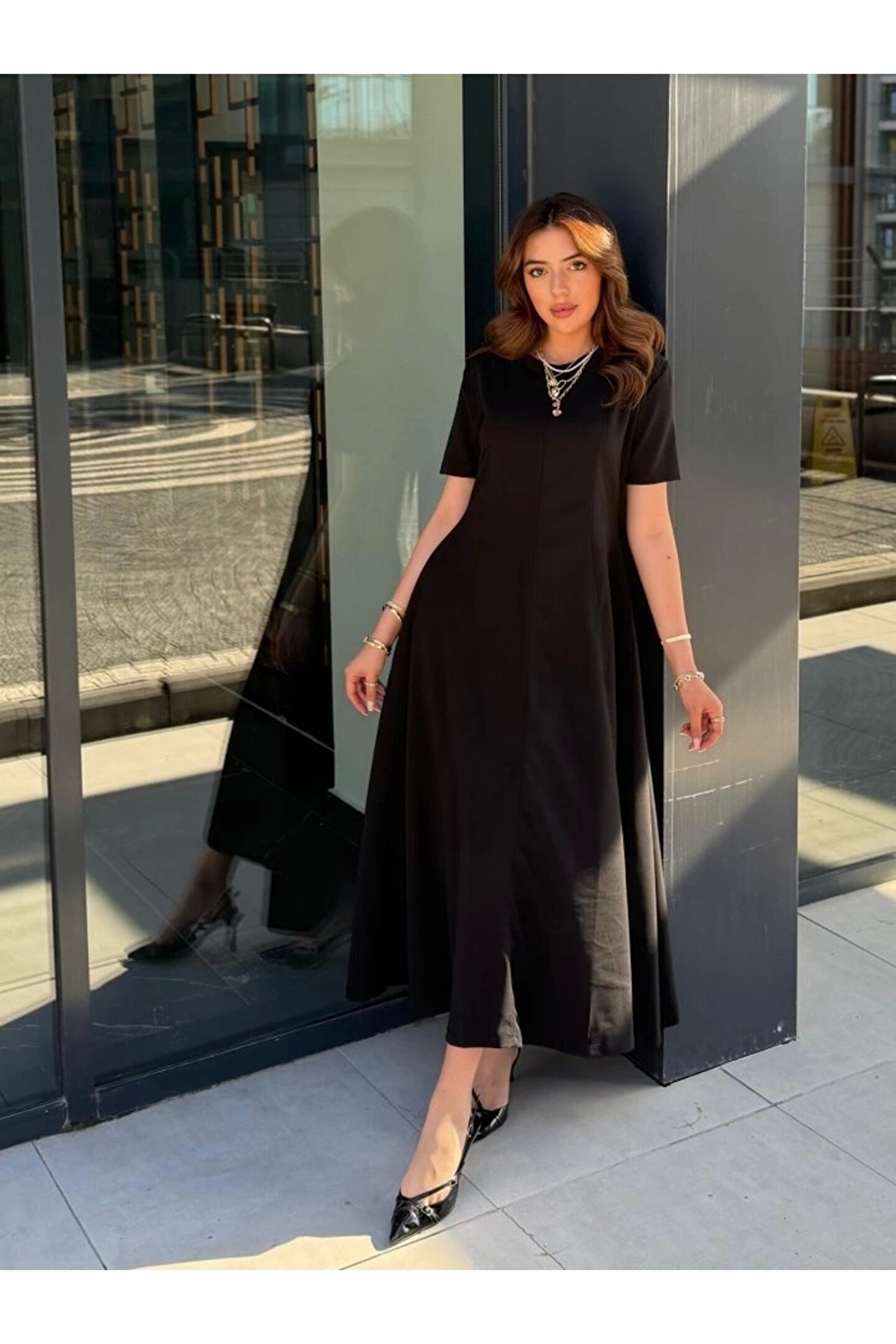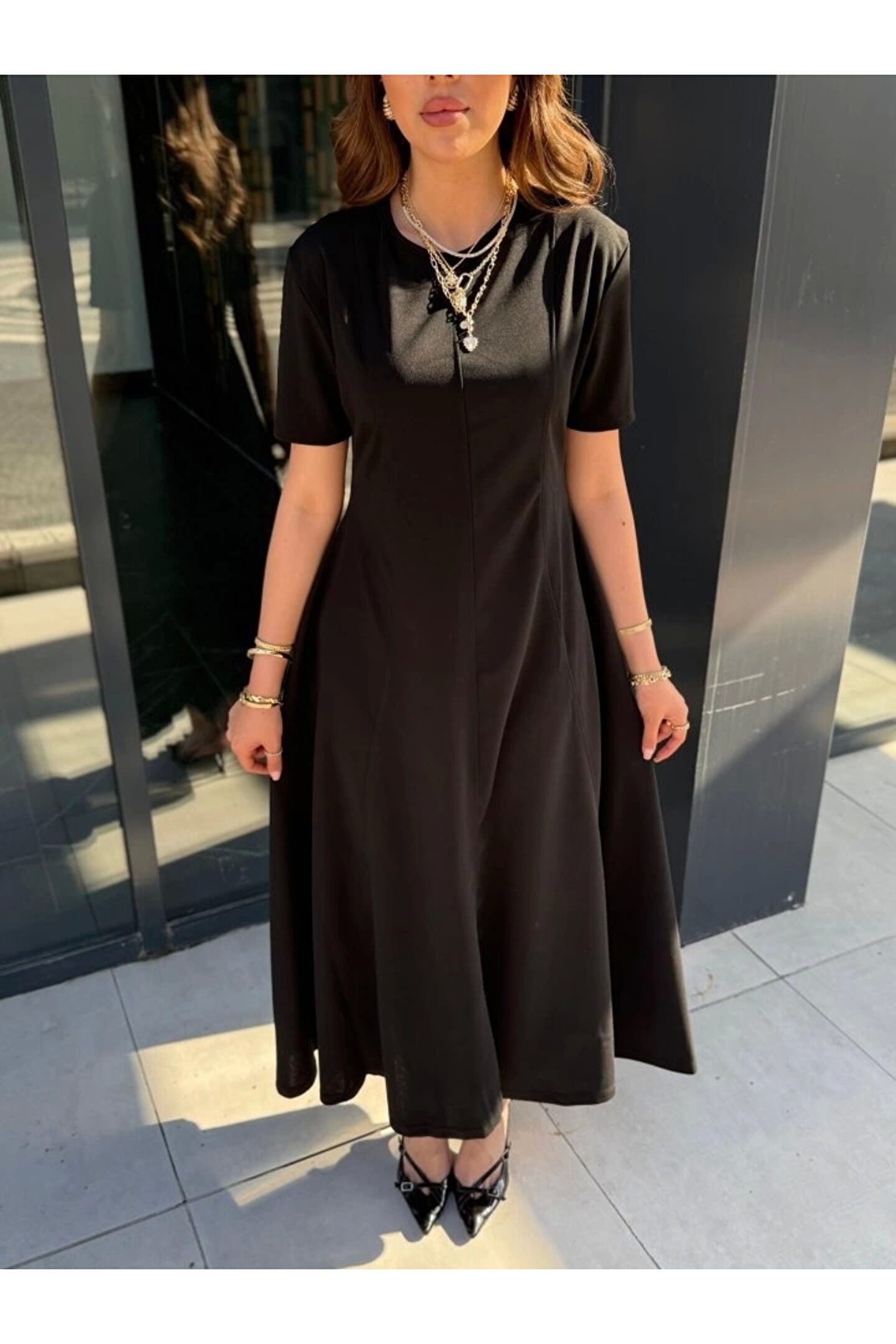 Wear Up Kadın Kısa Kollu Bisiklet Yaka Maksi Boy Ithal Krep Elbise